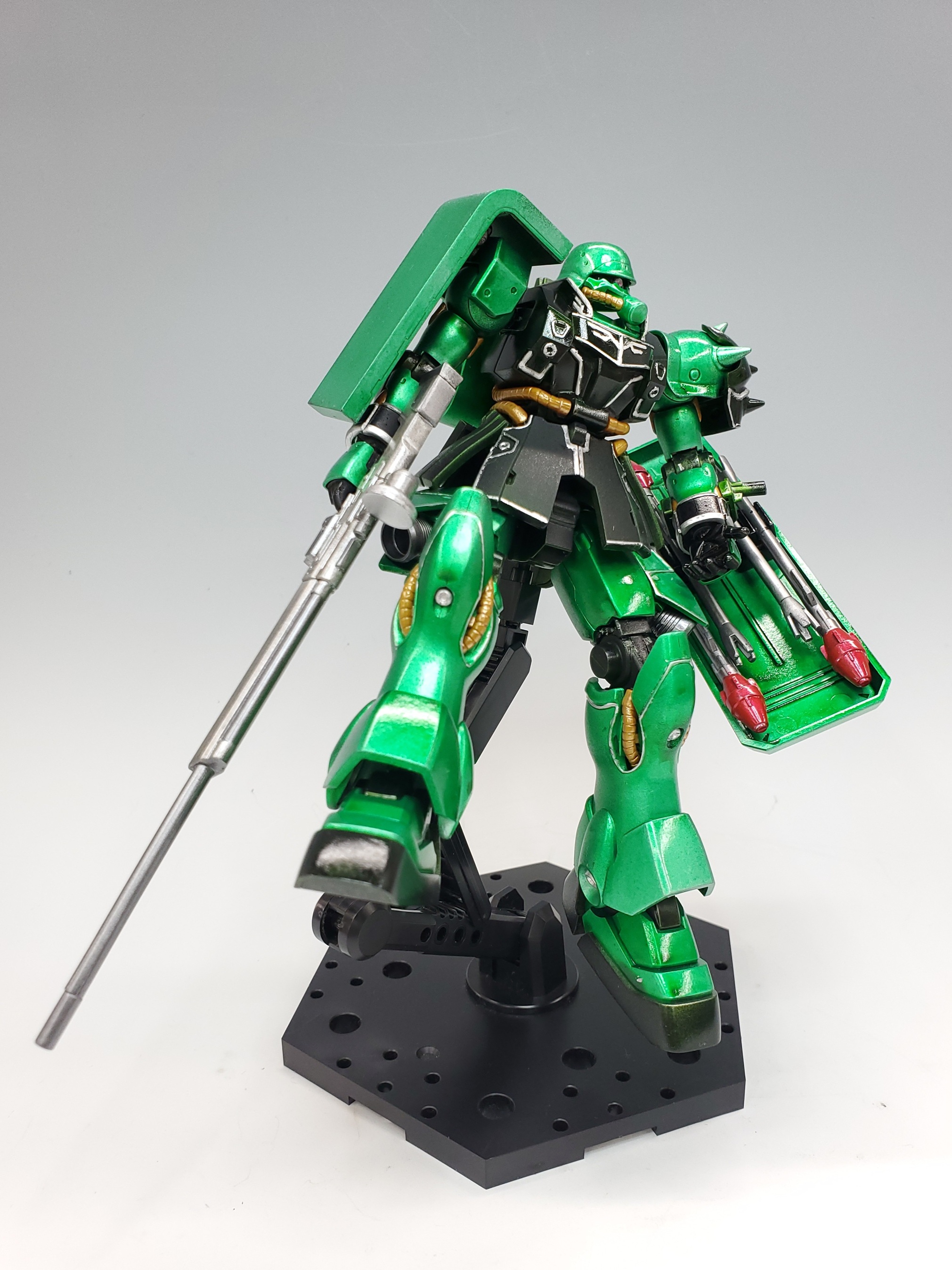 スタッフコメント:「機動戦士ガンダムユニコーン」より、HGUC ギラ・ズール(キュアロン機)が登場。ファレホ インクカラーを使用した煌びやかなキャンディ風塗装で仕上げてくださいました。コメントされているように、「きんたくんて」様は本作品の制作で初めてのエアブラシ塗装に挑戦されています。