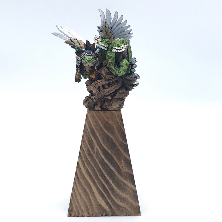 というわけでいいですね、配色がっ!ケツァルコァトルが下にまたがっているのはアステカの遺跡をイメージした台座になるのでもちろん店長も塗りましたが、石!岩!として塗っております。がジョニー様の手にかかるとどういったことでしょうか、柔らか味のある木のようなイメージ、そしてそれを支えている本当の木製の台座との色味もあって見事に調和をしているではありませんかっ!そして緑を主体としたボディのカラーリングが茶色の台座と抜群の愛称を生み、幼龍としてまさにこれから木の上からの大冒険を感じさせる作品となっております!