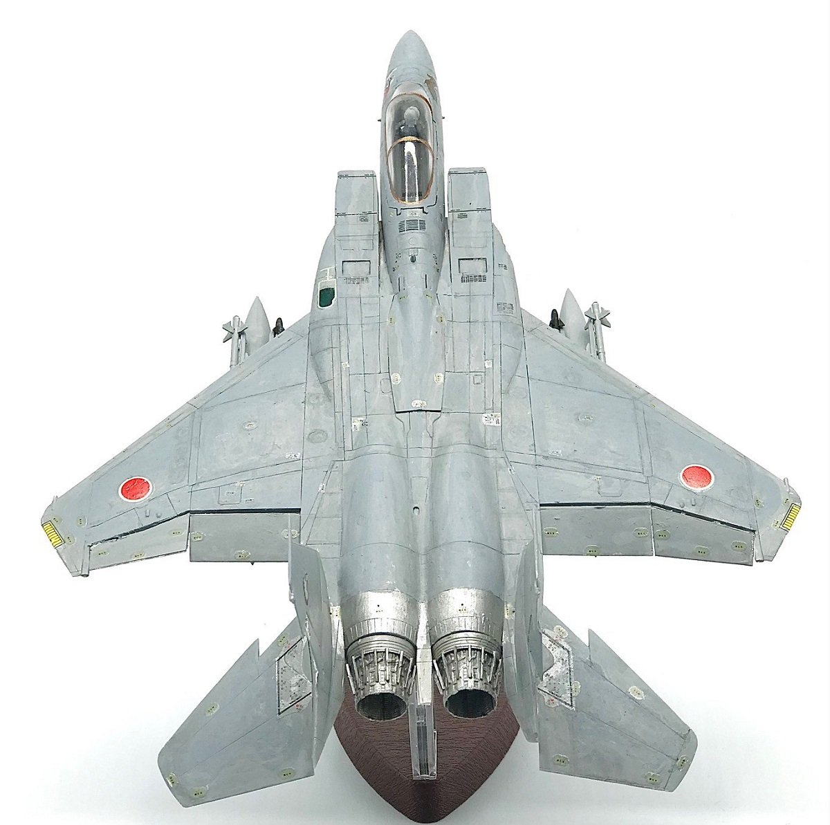 また上から見ることでよくわかる!グレーの階調表現ですね!部分的にムラを残したり、パネルラインで塗り分けを行うことで、ノペーンと平面的になりすぎることなくより実機の凹凸や立体感が際立ってくれていますね。またね~、飛行機モデルのあるあるではありますが、そのデカールの多さも特徴的!一枚一枚丁寧に貼られたデカールは必見です。特にこのキットだけの限定のデカールですしね、グリフォンやナイトはもちろんそのデカール総数はもちろんこの小さい中に100を軽く超えていくんで・・・本当にお疲れ様です!