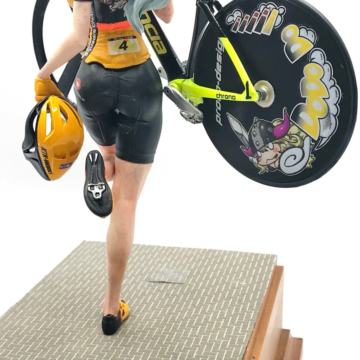 後ろから見てみると、色白だって日焼けはするんじゃい!と言うことでポイントで足に日焼け表現を施していることで最上さんの毎日の練習の大変さがみに染みてきますね!うむ、そしてやはりこちらから見るとこのキット絶妙バランスが多すぎる!このヘルメットほぼ指に引っかかっているだけではないかっ!不思議と最上さんはとてつもない【動】の表現の集合体ですが、担がれている自転車は無機物と言うことで【静】の印象を受けます。しか~しこれも、【動】は肌ムラや陰影を強く、【静】はとにかく綺麗に均一にと塗り分けをされていることでより強調されている妙技・・・・