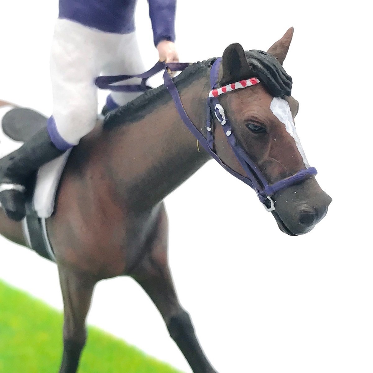 んでもってご尊顔も見ていきましょうね!これまた特徴的な黒鹿毛!顔の褐色からのグラデーションが本当に特徴を捉えていますね、元の造形もしっかりしているタミヤさんですが、塗によって何の変哲もない馬が本当に名前をもらったお馬様に進化を遂げたのだっ!また目にも注目ですね、ウルっとした優しさを感じる馬のお目目がとっても印象的です。模型道(改)様の馬への愛をひしひしと感じますね。