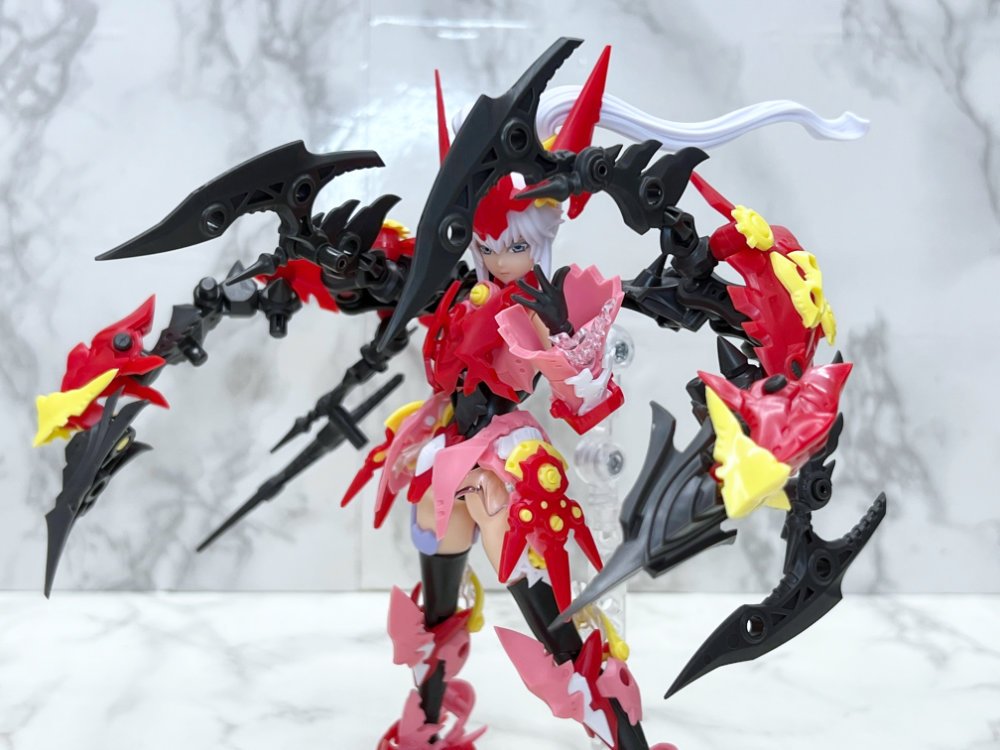 "軽装状態"でのメインカラーだったピンクのアーマーの上から、赤いアーマーを追加で組み付ける部分もあり、薄いパーツが折り重なることで、更に"花"をテーマにしていることがわかりやすくなっています!
