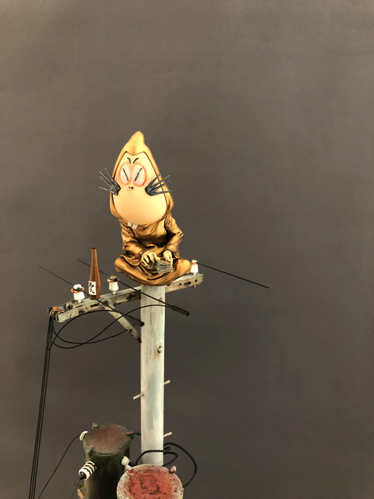 電柱や街灯の寂れ具合の再現の見事さはもちろんですが、電柱の天辺という非日常の空間で、札束を勘定するという実に散文的でねずみ男らしい現実感のミスマッチが、ゲゲゲ世界の日常と非日常の曖昧な境界線を感じます。