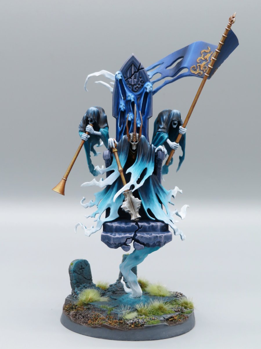スタッフコメント:幽霊のふわふわと漂う様がグラデーション塗装で見事に表現されています!怯者王クルドス・ヴァレンティアン本体や青白く不気味に照り返す墓標も素晴らしいですが、背面の幽鬼の表現が私個人といたしましては勉強になります!しゃれこうべの目の奥を明るい色で塗るとこのように妖しく光っている様に見えるんですね!