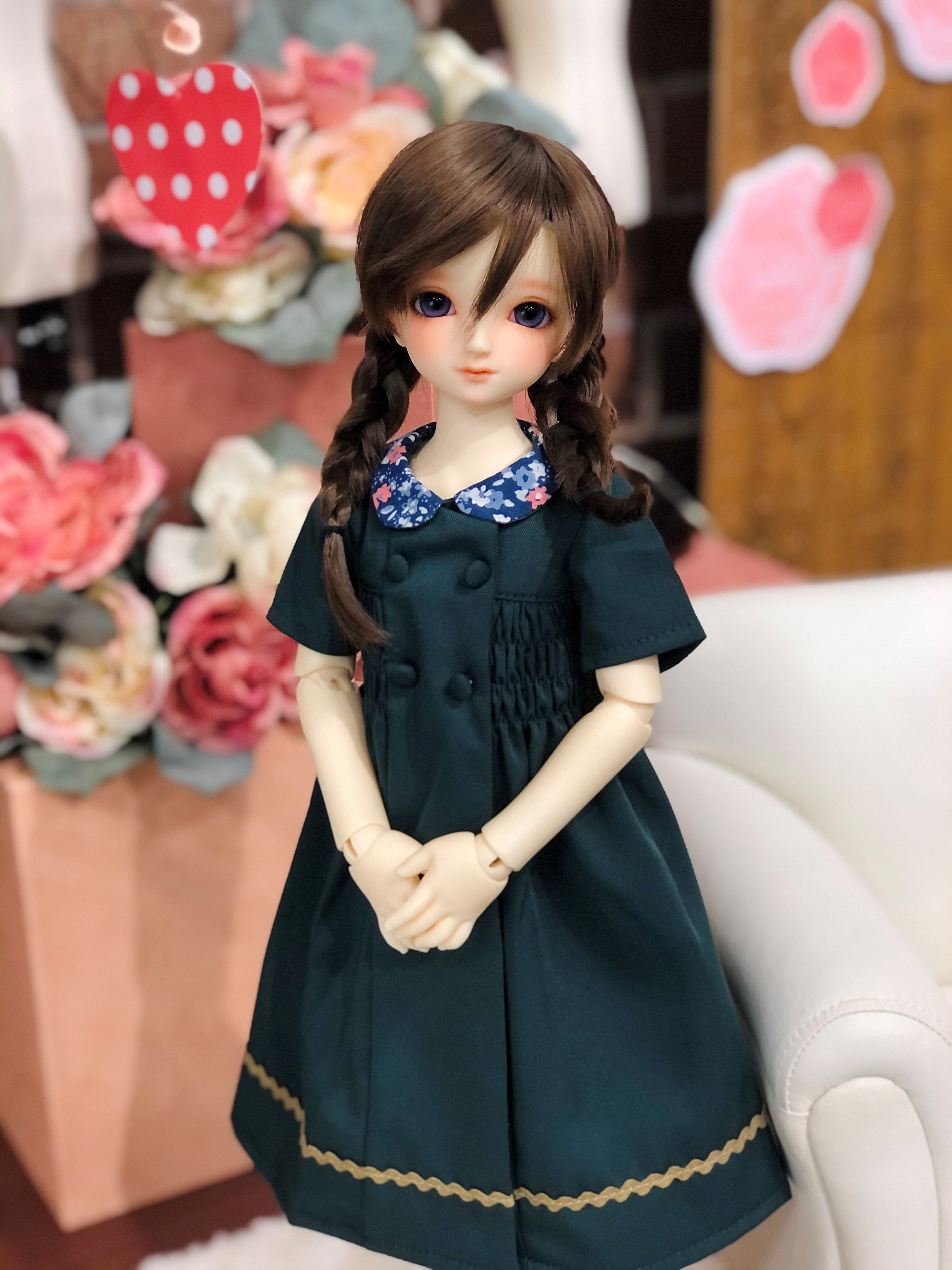 SDM~DearSDにもオススメなワンピースセット♪カーディガンはドルフィーサイズに編まれたリアルなケーブル模様が特徴です。ワンピースは上品なくるみボタンとシャーリングのデザイン。手編みニットのお花ブローチも付属するとっても愛らしいドレスセットになっています。