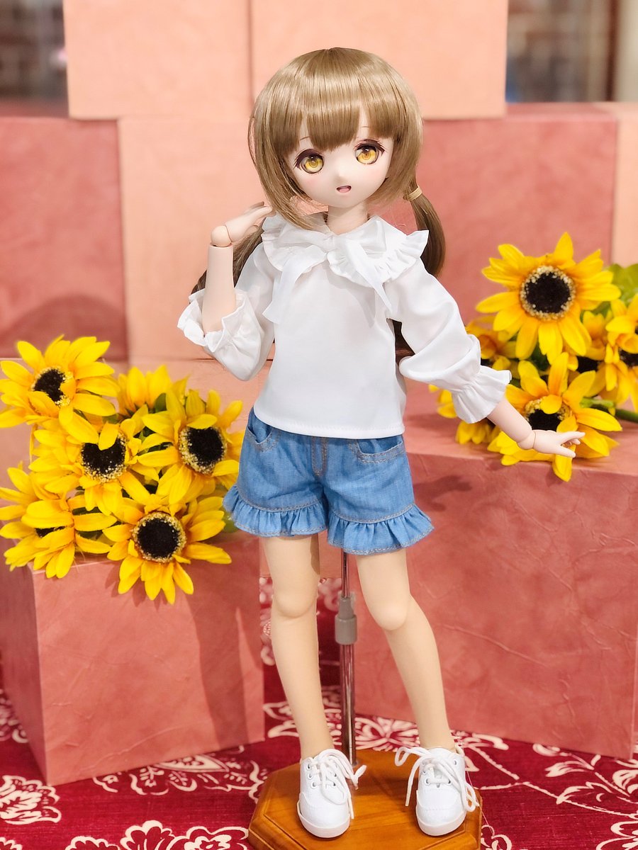 大きな丸襟が可愛らしい、このシーズンにピッタリの白いブラウスにフリルショートパンツをあわせて♪