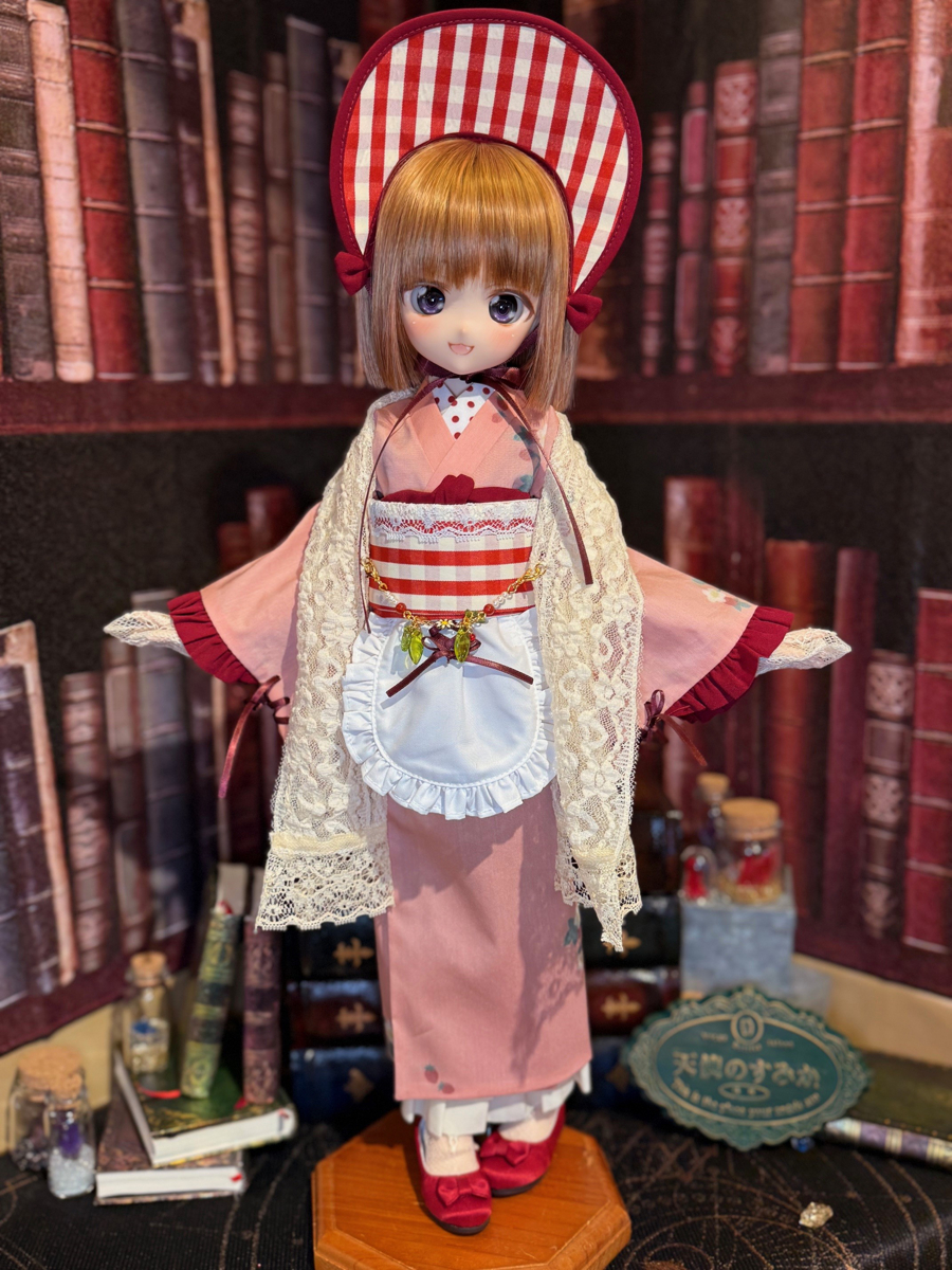 野苺柄のお着物とレースのショール、エプロンが和洋折衷な雰囲気を醸し出していますね♪