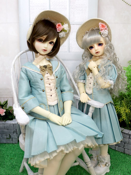 色合いのドレスと軽やかなストロー素材のボンネットは、夏の庭にぴったりのセットです。