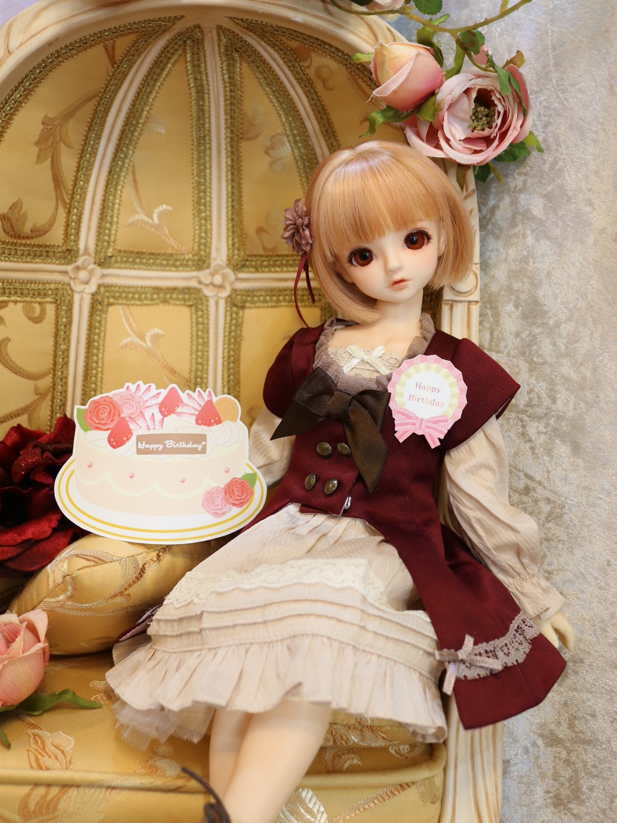 記念写真テーマ「バラ色」に合わせて、赤のドレスや華やかな装いが似合うスペースをご用意いたしておりますので、まだ撮影されていない方はぜひご利用くださいませ。