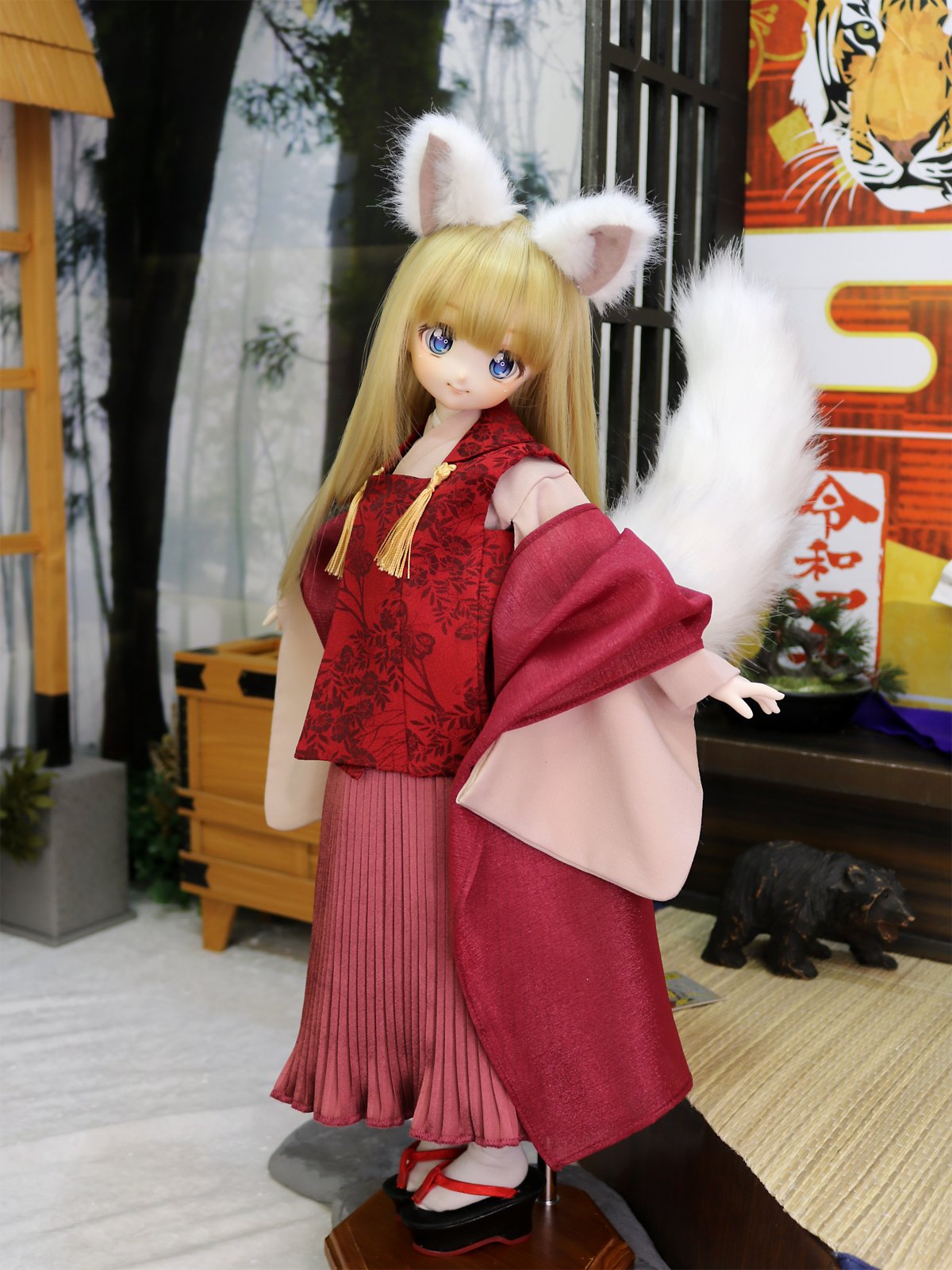 紅の織り生地をお被布としてお仕立てた「妖の衣~山茶花~・ミニ」は、しんと静かな庭に咲く鮮やかな山茶花の花のような一着。
