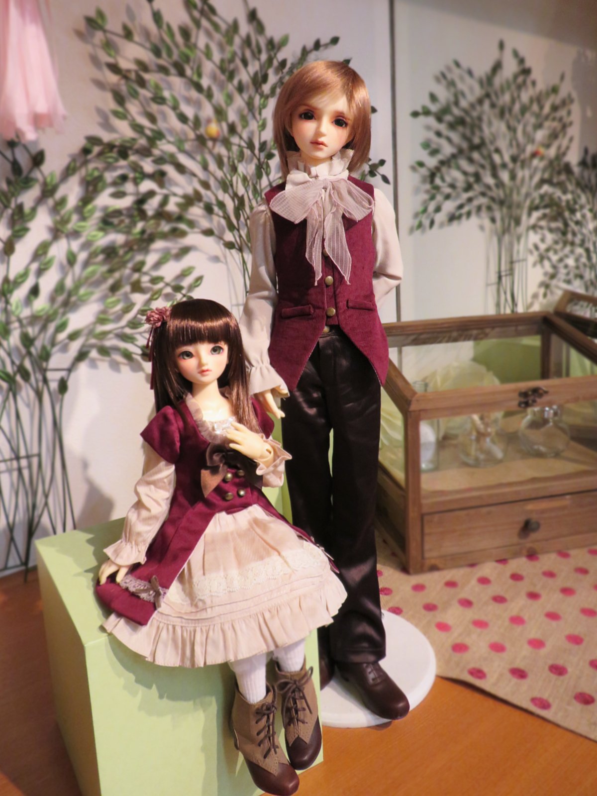 紅茶染めのような風合いのインナーに深みのあるローズ系のカラーのオーバーワンピースやベストを合わせ、リボンやパンツはチョコレートカラーとなっており、シックで上品なドレスです。