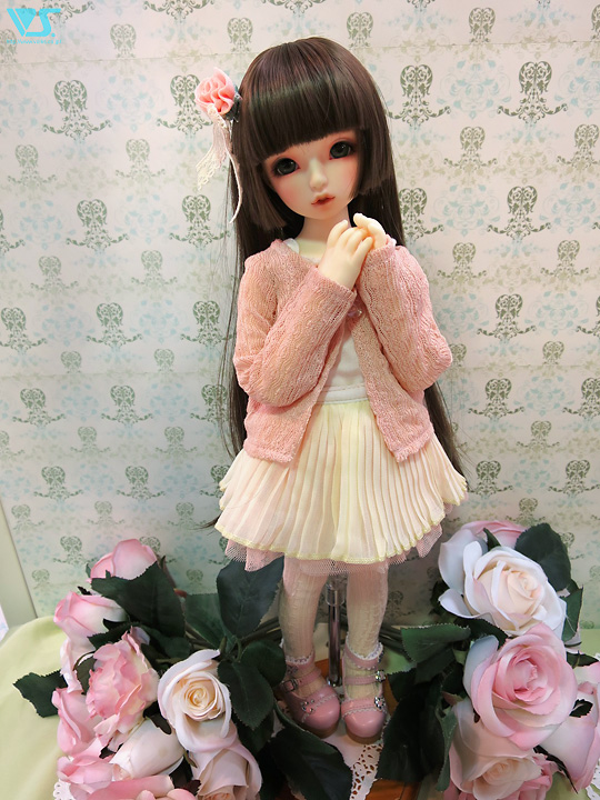 着用ドレス :スウィートピンクカーデセット、オーバーニーソックス・ミニ(白・編みニット)