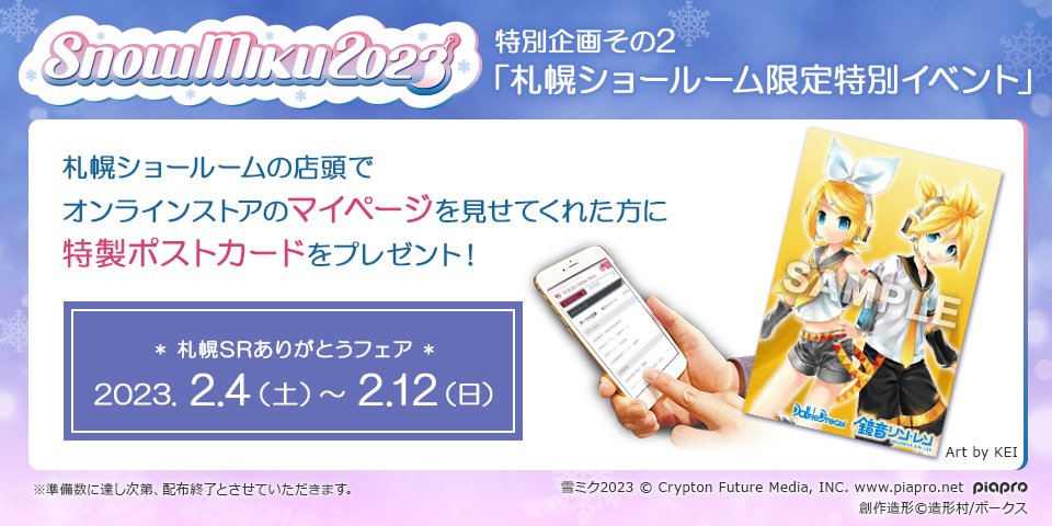 また同日開催の「札幌SRありがとうフェア」では、札幌ショールーム限定特別イベントとしてオンラインストア登録キャンペーンを開催!オンラインストアにご登録いただき、店頭にてマイページを見せていただくと鏡音リン・レンの特製ポストカードをプレゼントさせていただきます!