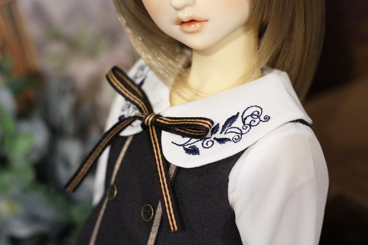 襟元には繊細なリーフの刺繍が施されており、シックなカラーのドレスにそっと愛らしさを添えてくれます。