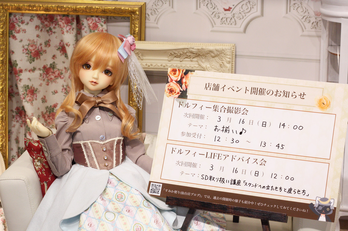 12:00からは、「ドルフィーLIFE☆アドバイス会」を開催いたします!今回のテーマは、SD取り扱い講座「スタンドへの立たせ方と座らせ方」です。ドルフィーとの暮らしがもっと楽しくなるアドバイスを、ドールアドバイザーが実技を交えてご紹介いたします。参加無料でどなたでもご参加いただけますので、ぜひお越しくださいませ。