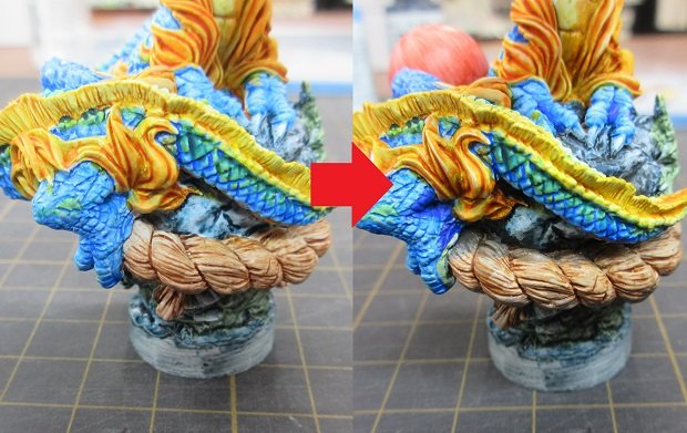 龍神の青色のウロコなど、光が強く当たる部分には、