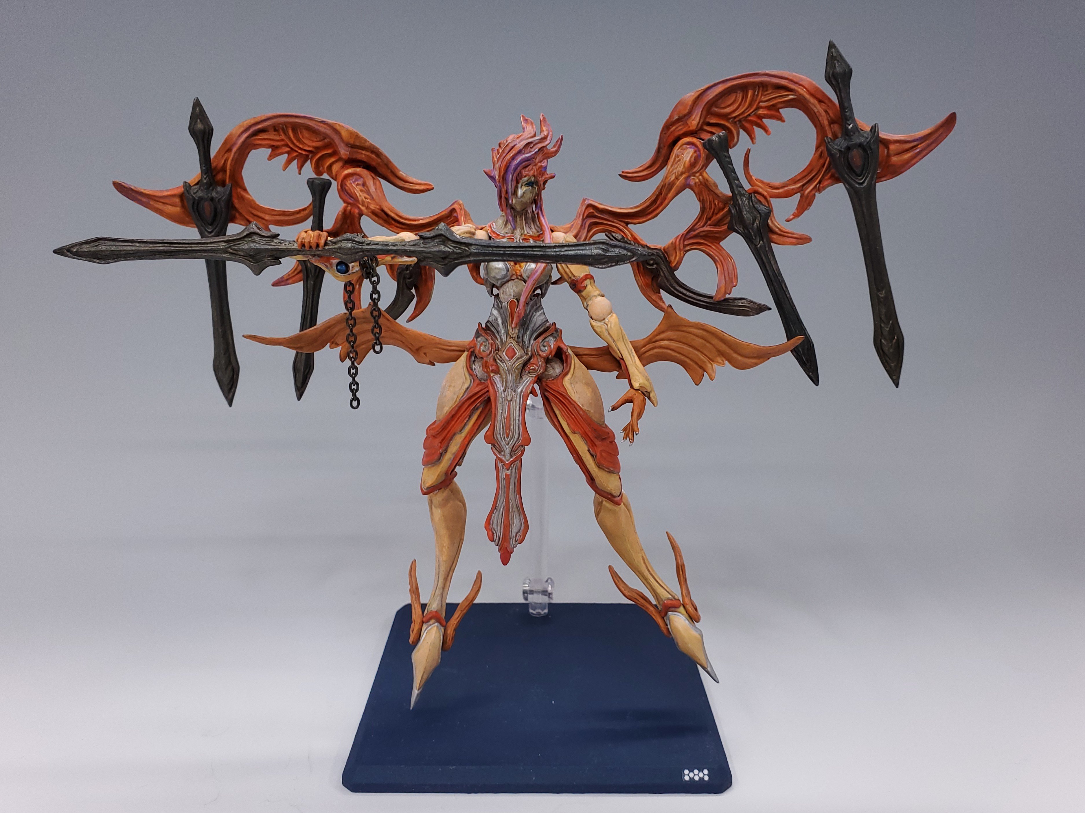 イヴァレが持っている両剣や背中の刀剣には、ダークブラウンのような暗めの茶系を使われていて、本体と併せて見ると同系色で塗られた統一感ある配色なのが分かります。また刀剣にも造形モールドを活かした塗装をされており、暗めの色でも模様がはっきりとわかるくらいの濃さで塗られていますね。