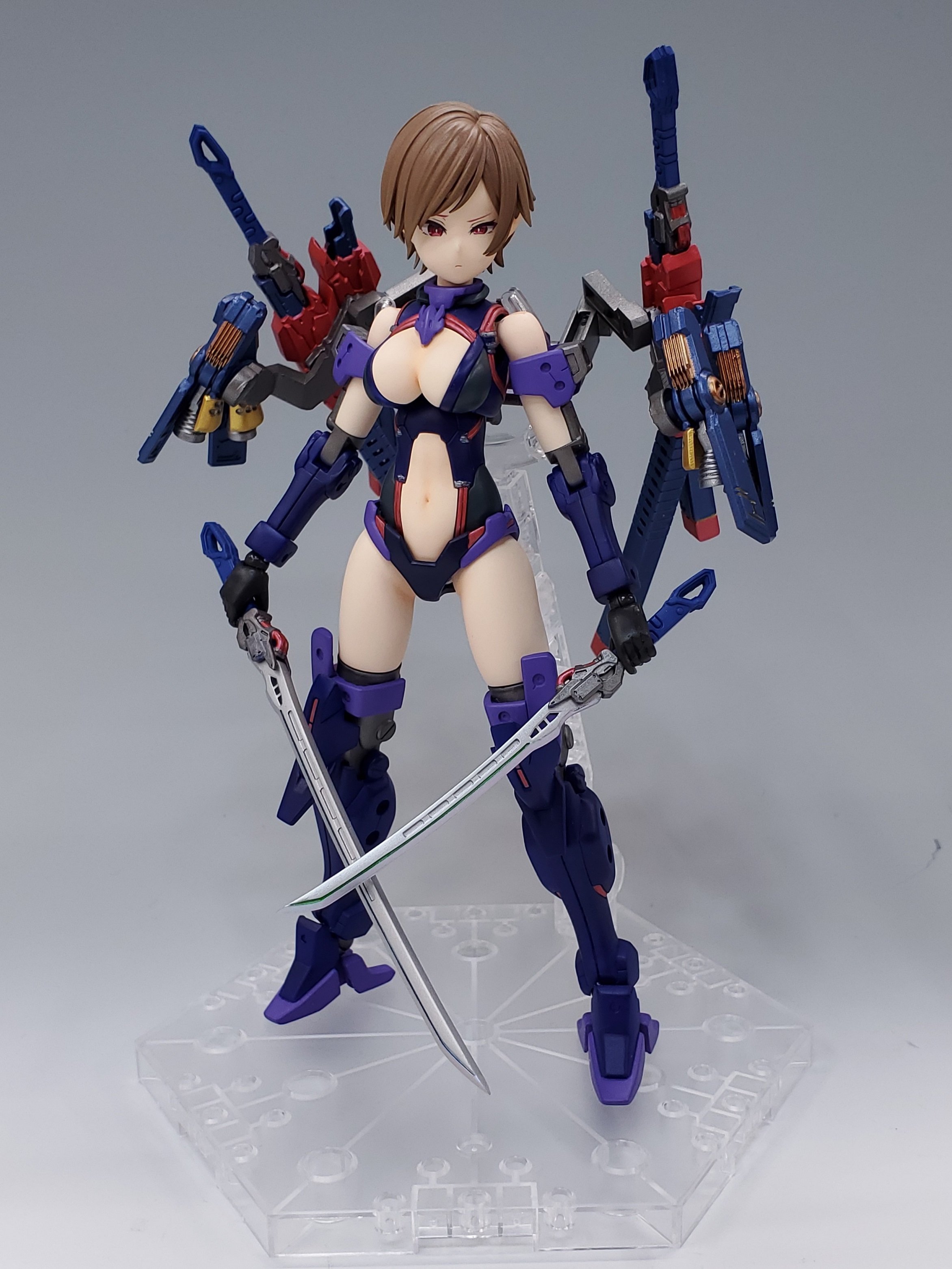 カラーリングは、黒・青・紫と寒色系カラーでまとめており、赤や金をポイント塗装とされております。またボディがつや消しで、武装はメタリックといった統一があるため、全体的にメリハリのついた仕上がりとなっております。