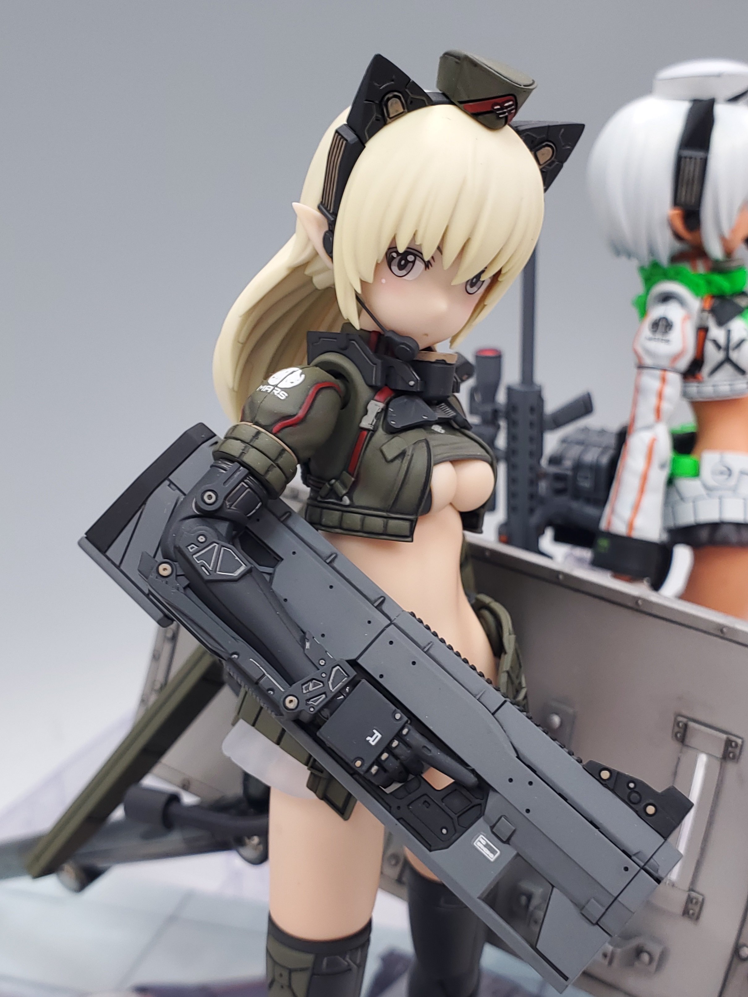 二人のカラーリングも「そうにゃん」様の丁寧な塗装技術で細かく表現されていて、服のシワや髪の毛のモールドなど柔らかいシェーディングで、フミカネ ART WORKSのイメージを見事に表現されております。武装している出で立ちとは裏腹に、とても可愛らしく仕上げられていますね!