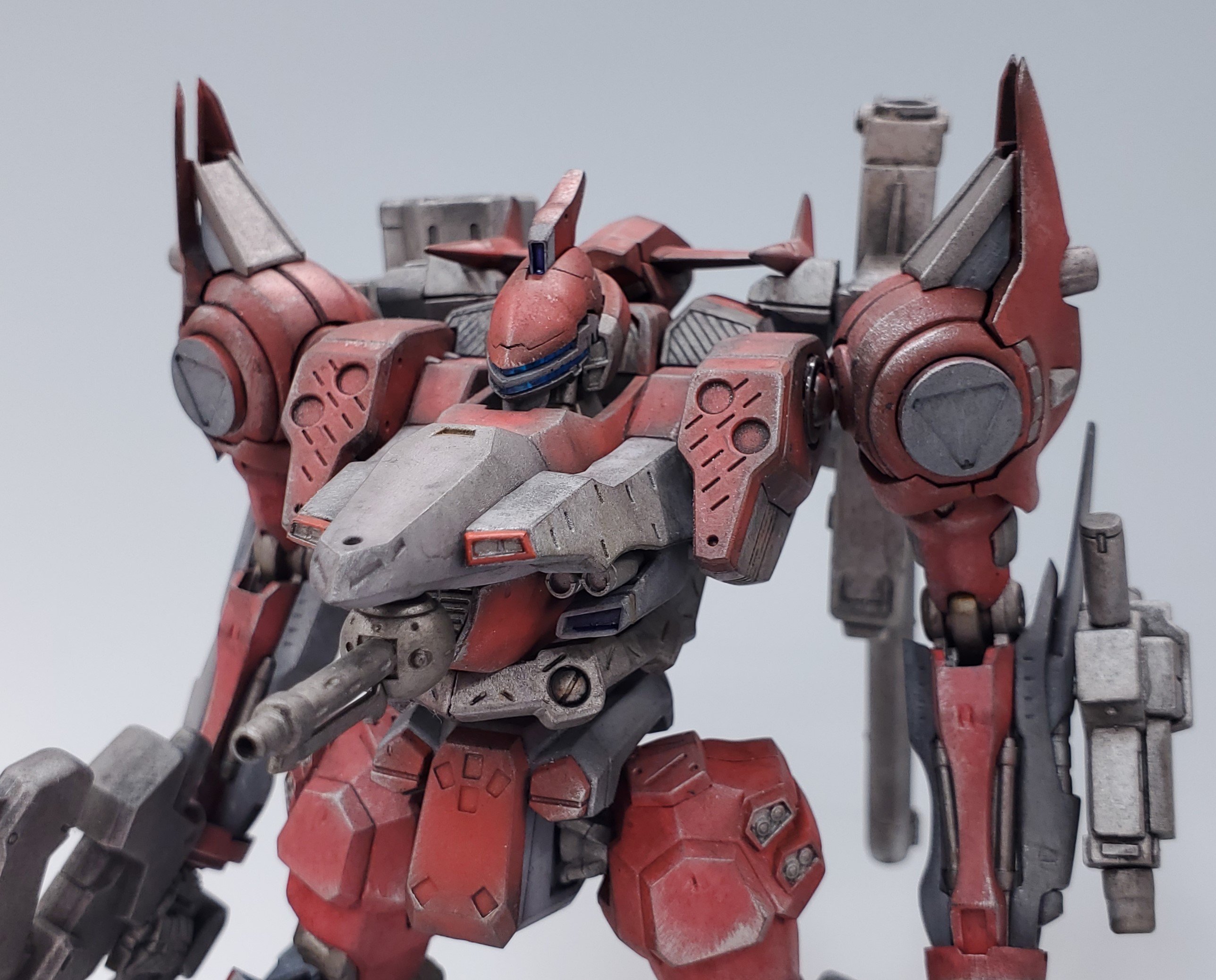 「zama」様はウェザリングとチッピングの併用によって、ナインボール全体の重厚感を出されています。エッジの強調やウェザリングの強弱を使い分けることで、塗装効果を更に引き出して、アーマード・コア独特の「荒廃した近未来」の雰囲気を表現された作品となっています!