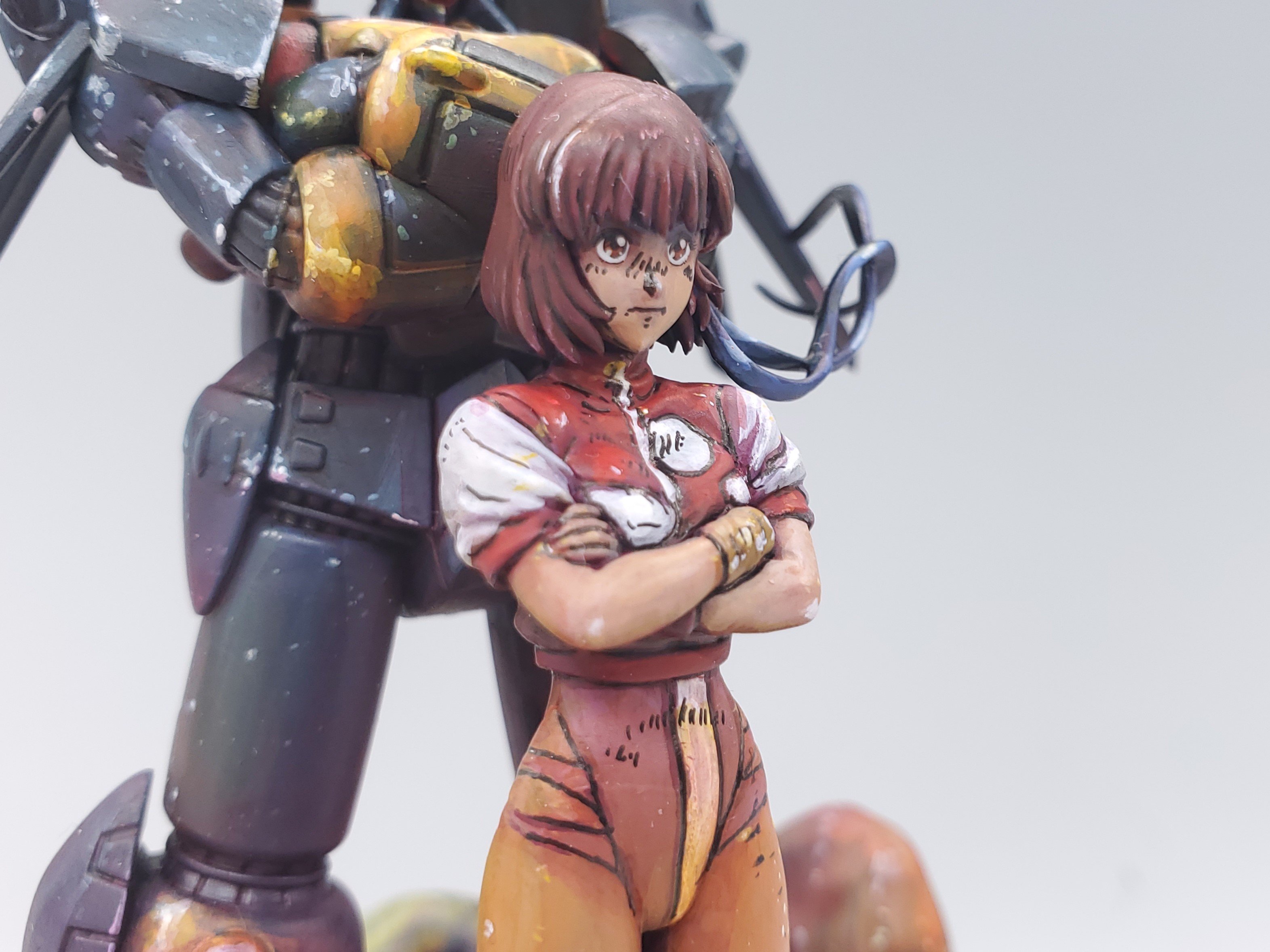 ガンバスターといえばこの人、主人公の「タカヤノリコ」ですね。ノリコはアニメ寄りのイラスト風ペイントを施されています。特に肌色はセルアニメのような塗り分けをされているのがわかります。また顔や服に見られる描き込み線がイラスト調演出のポイントとなっています。