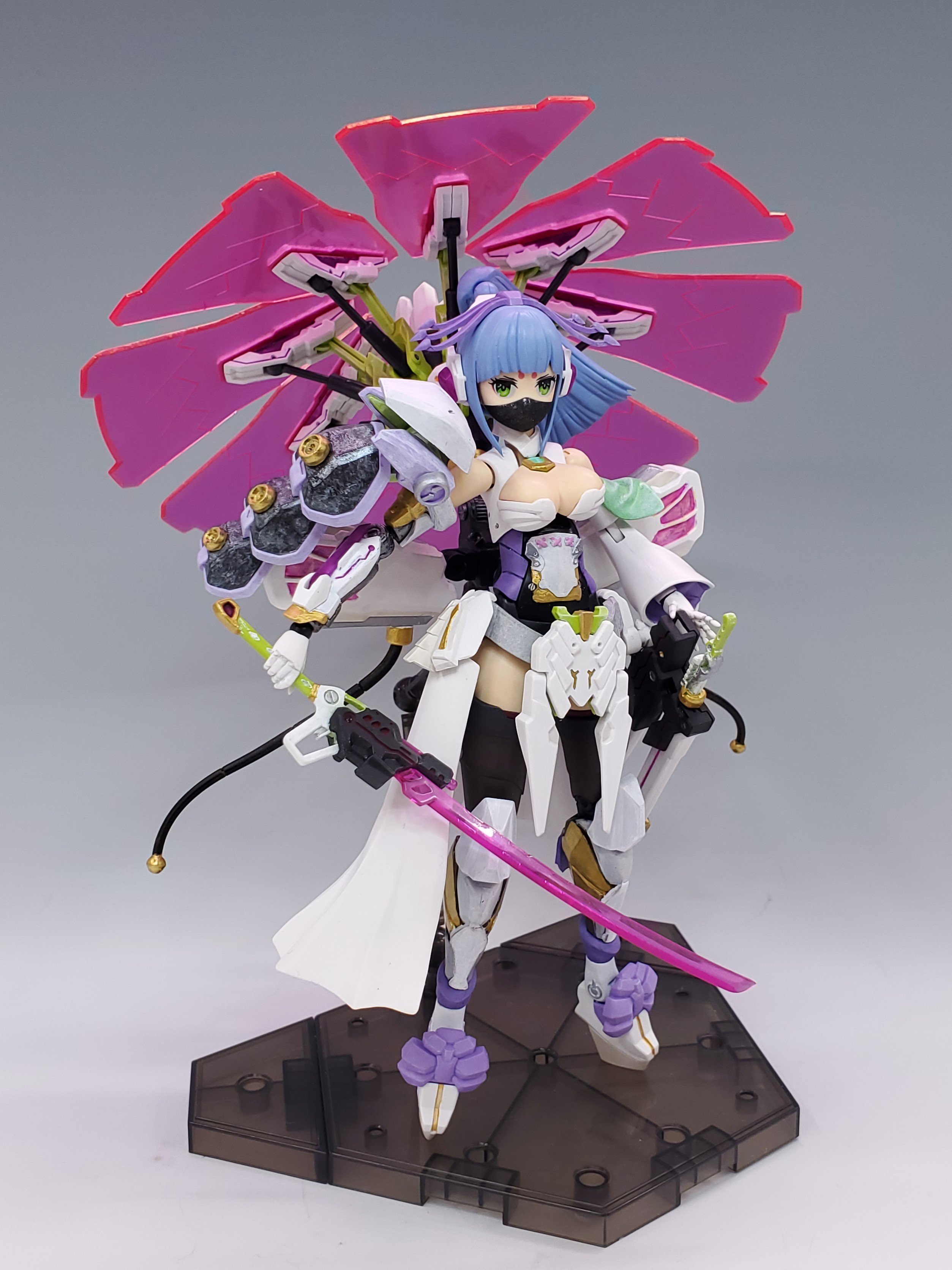 同様に黒一色だった脛の装甲も白や金で配色され、腰回りのパーツとの統一感も出ております。刀の鞘や腕、傘の骨にも見られるモールドはクリアパーツと同系色のピンク色にスミ入れがなされ、作品全体に華やかながらも引き締まった印象を持たせています。元キットの風貌を維持しつつも、見比べると「蒼不動」様による多くのアレンジに気付かされる魅力的な作品でした。
