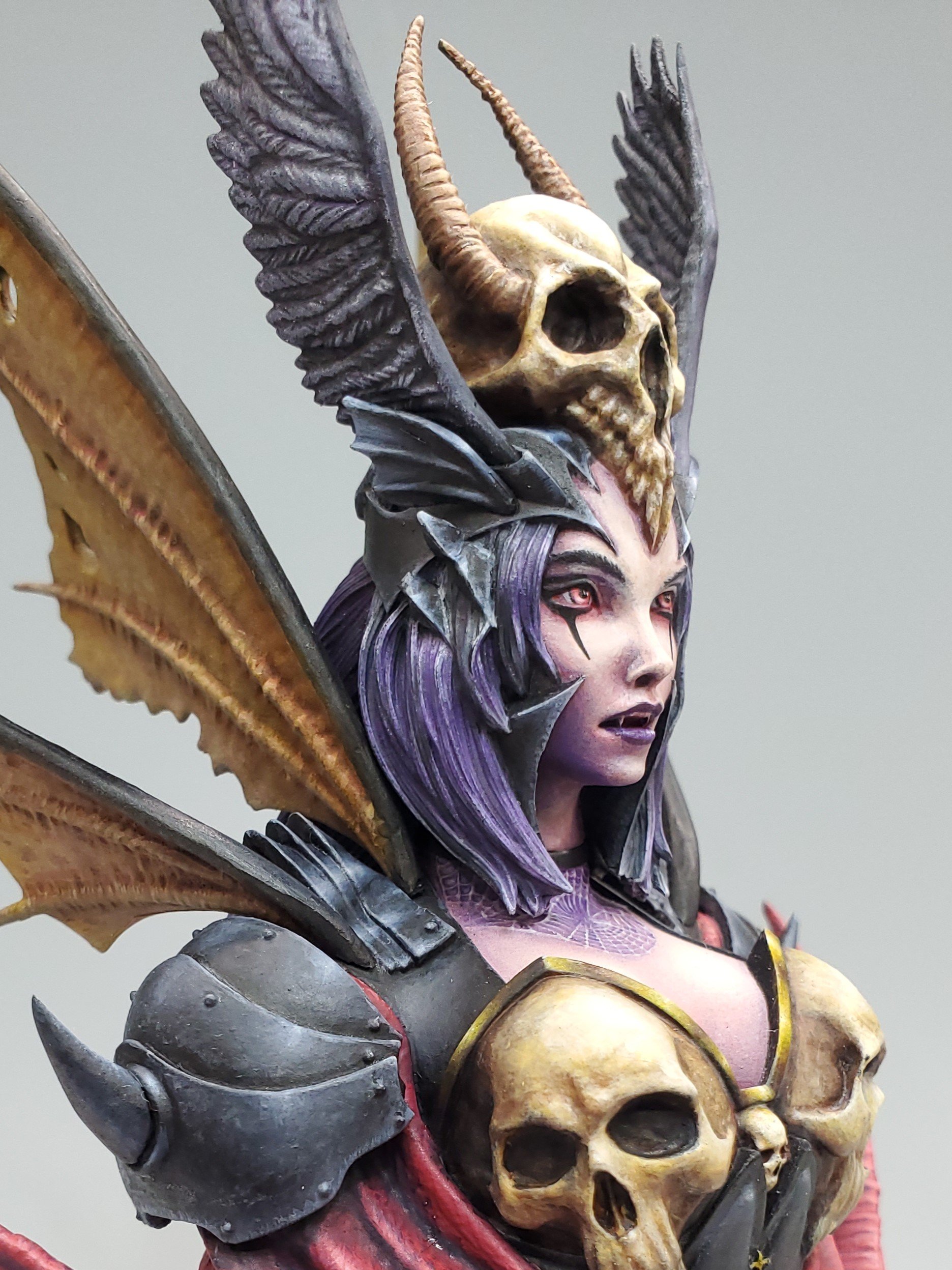 肩鎧のノンメタリック塗装に加え、マントのシワやハイライトからはシルクのような高級感が溢れ出ており、「人間の血を吸う怪物」というイメージを持ちながらも優雅な印象をもたらしています。さらにドクロの装飾は造形の堀の深さが強調されており、異界の装飾品らしい独特の存在感が表現されています。