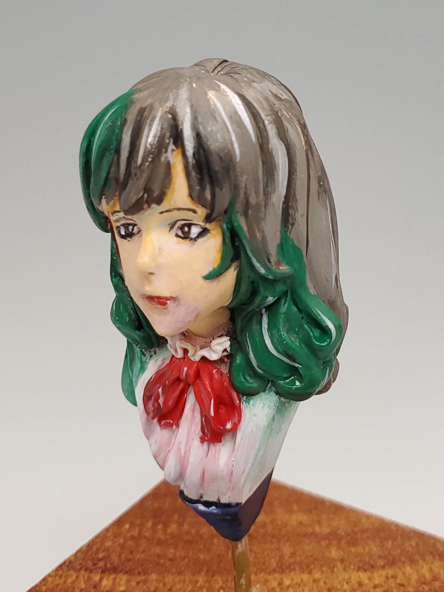 部分的に緑色が入った特徴的な髪の毛ですが、「まっしろならむね」様はこちらをご友人の髪を参考に塗装されたそうです。ちょうど髪型もキットと似ていたそうで、シャドウやハイライトもしっかりと再現されています。顔の塗装はコメントにもある通りMr.カラーのキャラクターフレッシュを下地にしており、そこからファレホを重ね塗りし、筆塗りで見事に血色の良い肌色を表現しております。