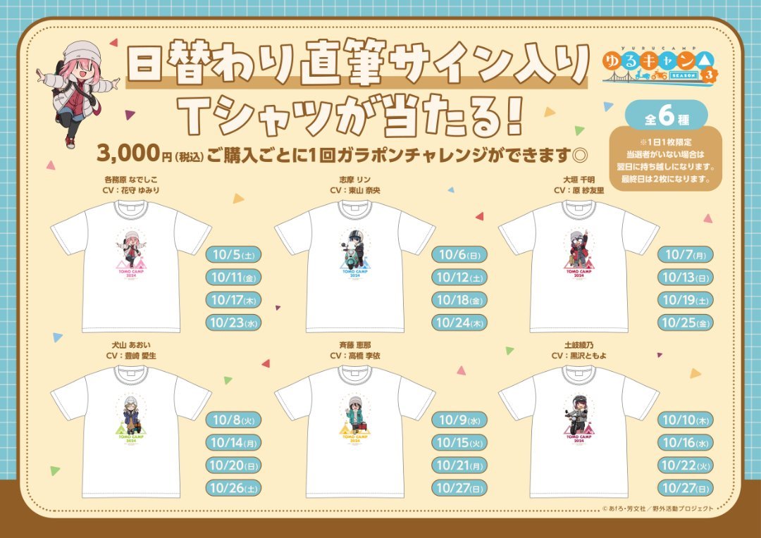 日替わりで「直筆サイン入りTシャツ」が当たります。