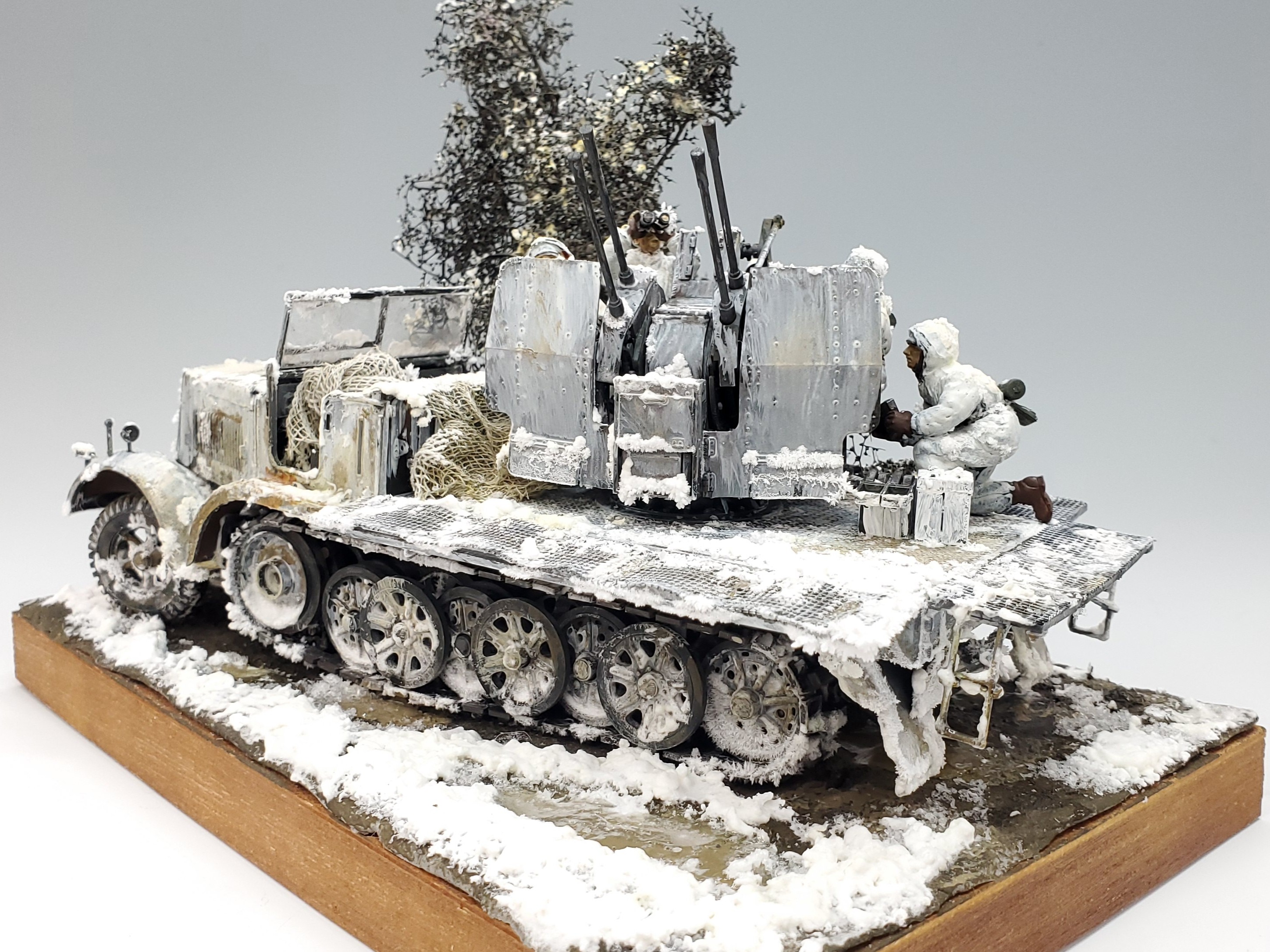 ミリタリー部門より、ドイツ・8トンハーフトラック 4連高射砲が登場。タミヤの1/35スケールキットを使用し、極寒の戦場を再現した東部戦線ならぬ"凍部"戦線のジオラマでエントリーしてくださいました。