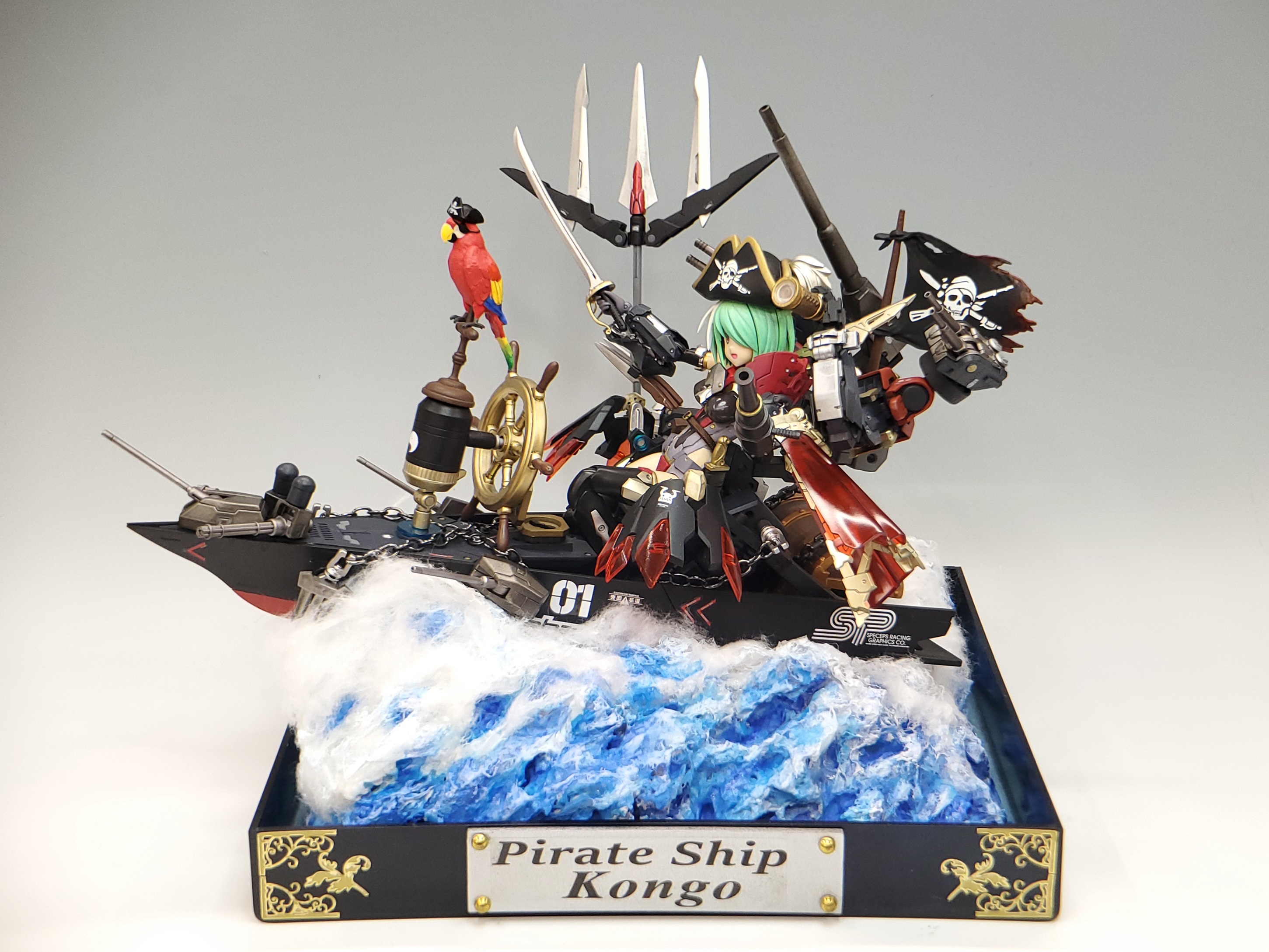 リーメント ぷちサンプルシリーズで装飾アレンジを加えられて、海賊船として装いを新たにした「海賊船金剛」が大海原を駆けるダイナミックなジオラマ作品となっております!