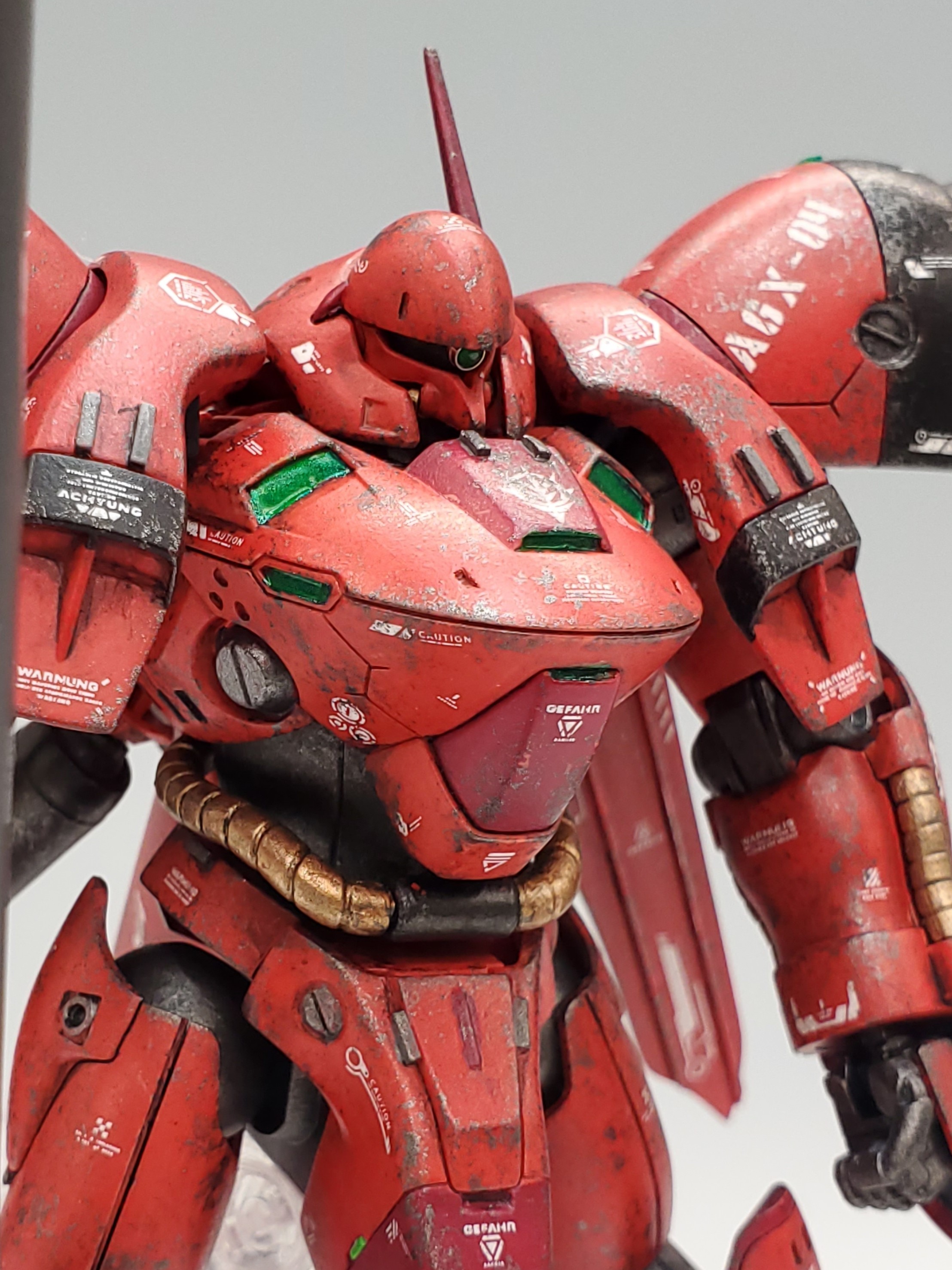 全身のウェザリング表現から重厚感を漂わせる本作品は、公式設定とは違うカラーリングで仕上げられているほか、ディティールの追加や武装のアレンジなど、全身にカスタムを施された作品となっております。