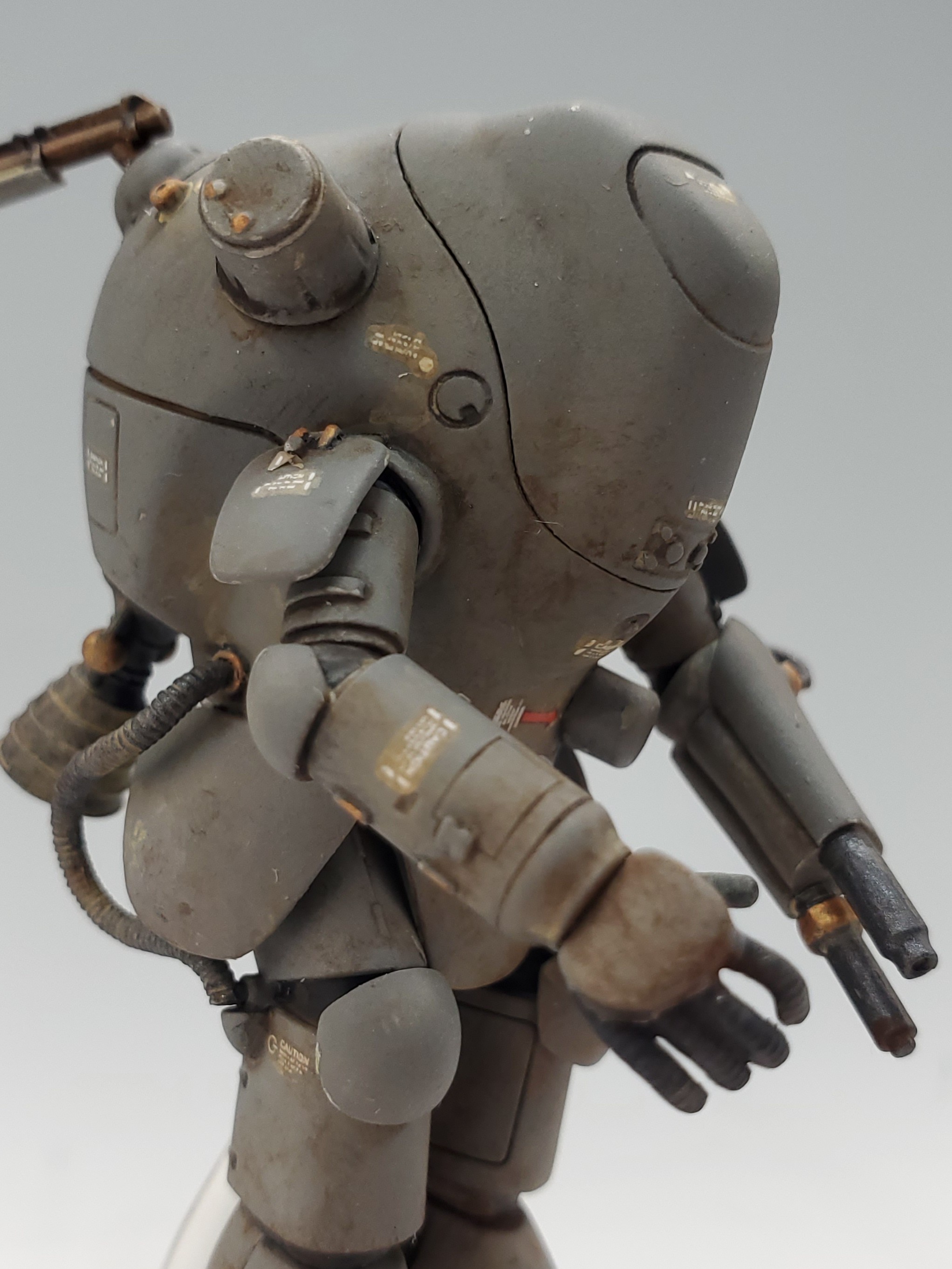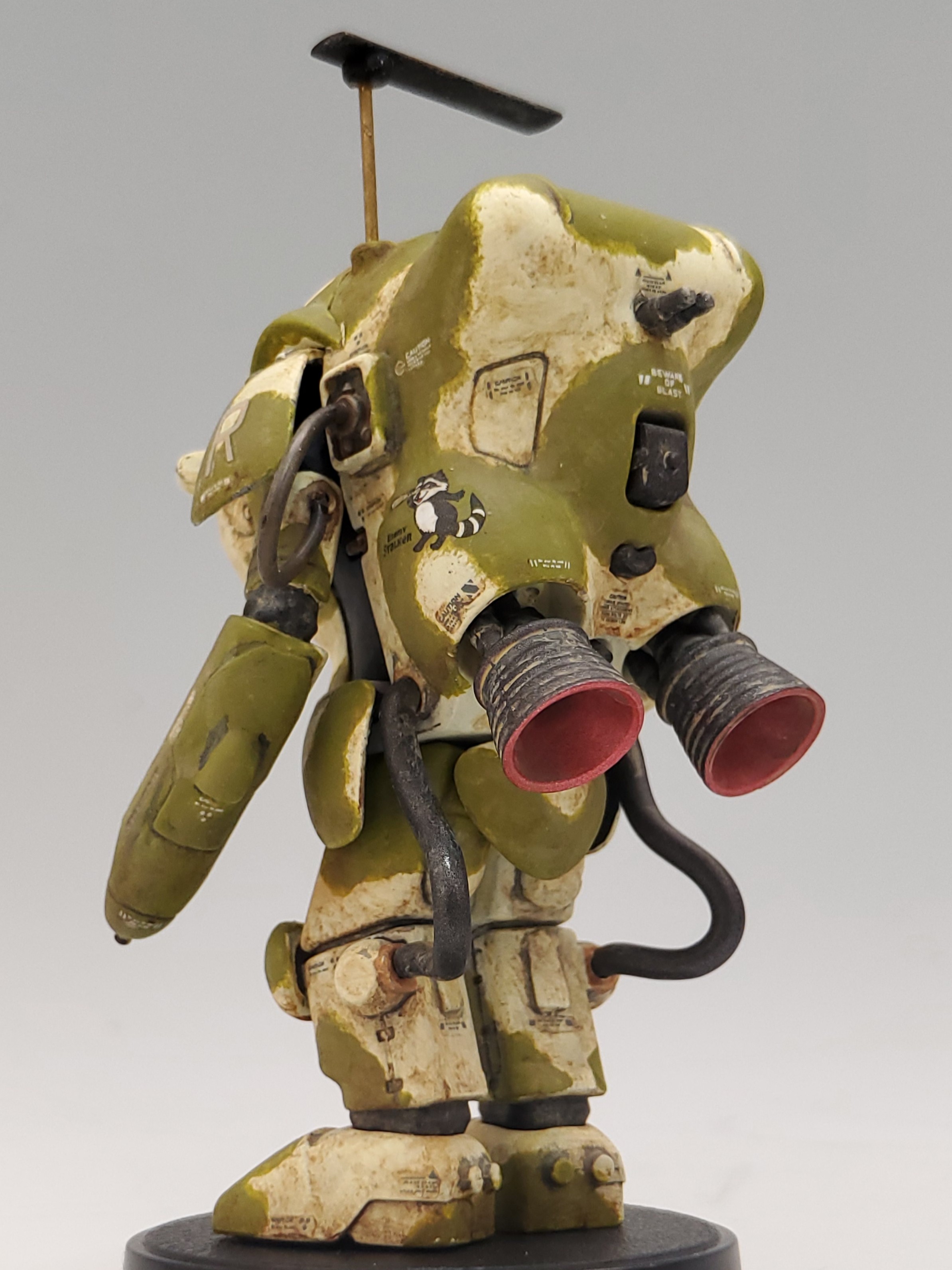背面は、バーニアノズルや動力パイプなどで入り組んだところが多いのですが、迷彩柄とウェザリングがしっかりと施されています。特に脚部のパイプにはサビや油汚れといったこだわりあるウェザリングも見られます。