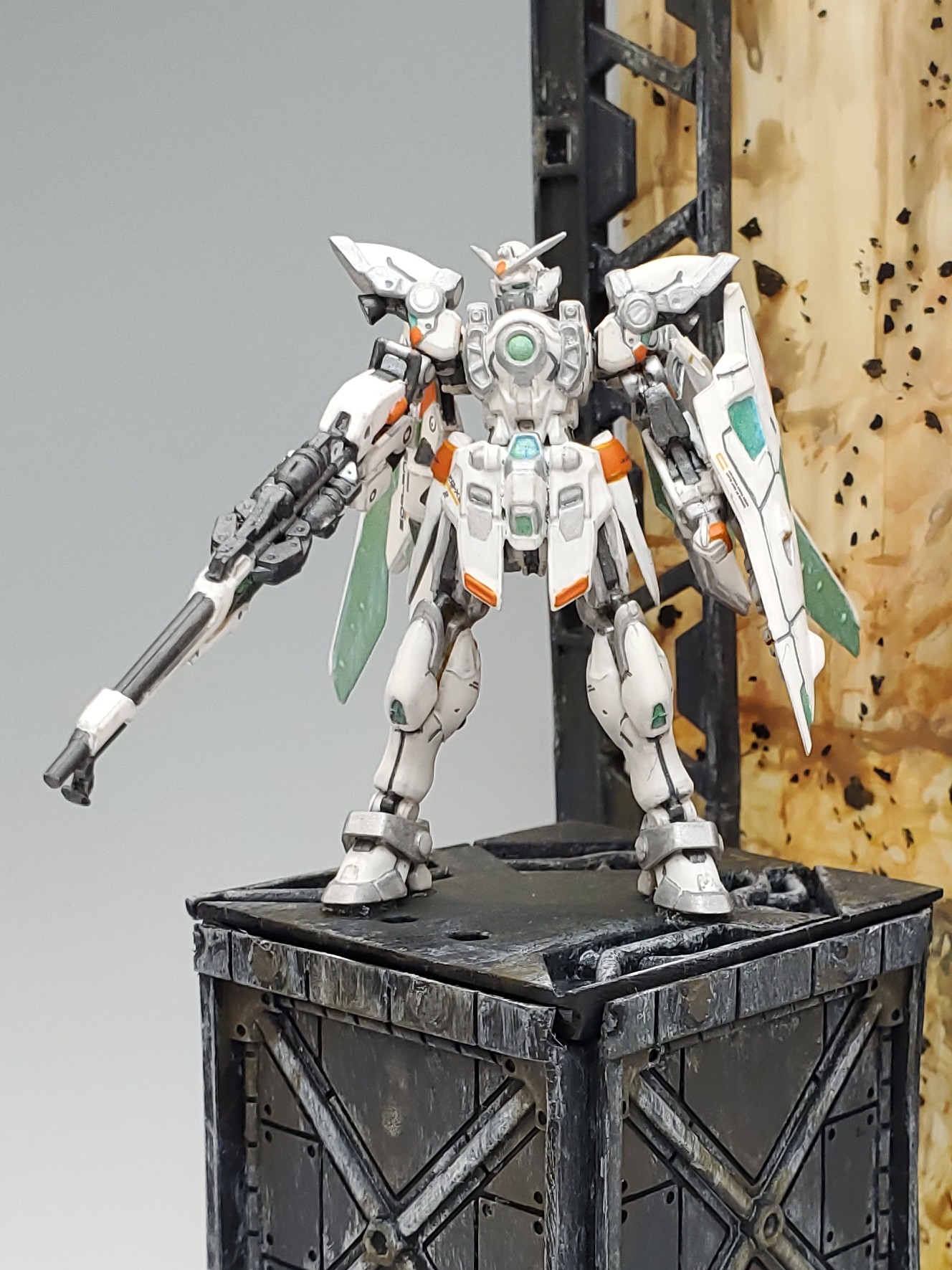 台座となる格納庫には重厚なウェザリングが施されており、手頃なお値段のディスプレイキットとは見えない仕上りとなっています。そして神聖なオーラを放つウイングガンダムとの組合せで重量感だけでなくストーリー性をもまとった姿に生まれ変わらせています。
