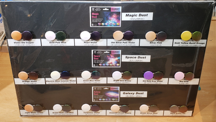 色味も豊富でマジックダスト、スペースダスト、ギャラクシーダストの3セット各6色入りでそれぞれ色味に特徴があり、どのカラーも捨てがたい美しい偏光カラーとなっております!