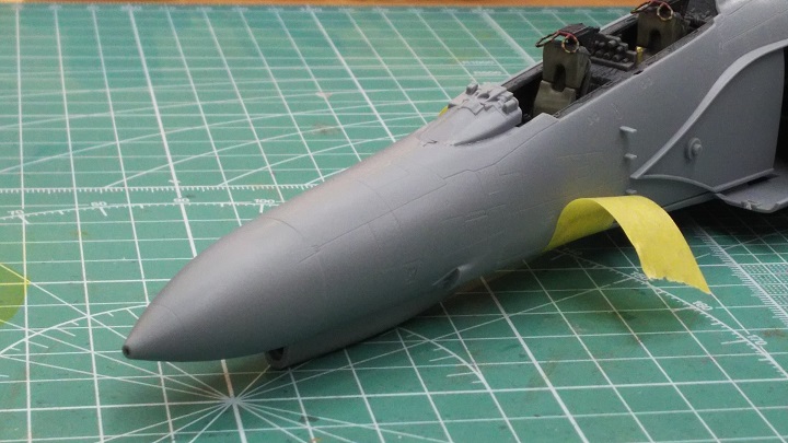 捻じれや隙間、ゲートの切り残しは無いかな?F-4のボディパーツは機首上面での合わせ目の処理と、ノーズコーンとの位置合わせが作業の肝になります。