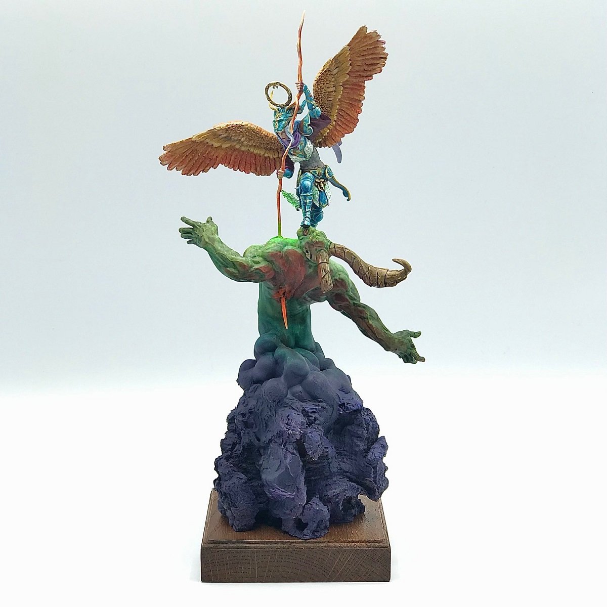 そして最終的に元が縦長のキットですがさらにこちら全体的に作品を縦長に盛って延長しております!そうすることでより迫力が増すうえ、化け物のモコモコ沸いてきた感じなどが伝わってきて作品のストーリー性を高めてますよね!グラデーションも本当に綺麗!ちなみに【すでに認められている作品】というのはこちらインスタでアラディアミニチュア社本人がこの作品うちの【天界の使者なんだぜ!】って紹介していたんです。本当に素晴らしいぃ!ある意味ご本人登場で公認となっている作品です!ぜひその目に焼き付けてくださいね。