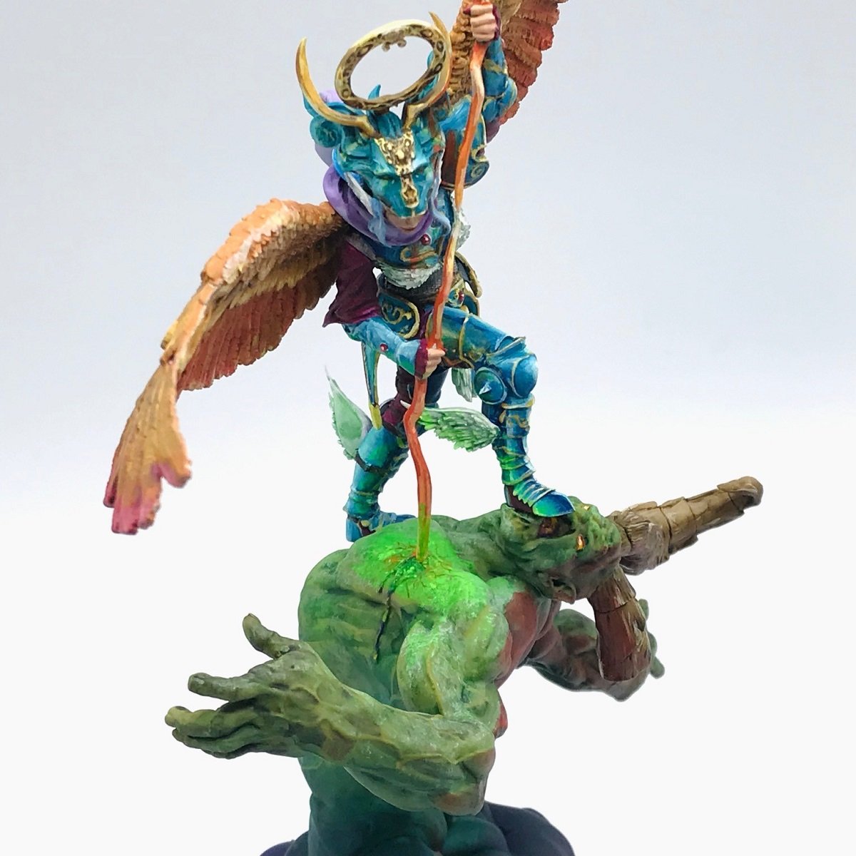では見ていきましょうよ!と言うことで大ボリュームキットをしっかりと塗り切ってくださって本当にありがとうございます!まず目を引くのが配色ですね、天界の使者として使わされた天使?は空を思わせる青の鎧と太陽を思わせる翼のオレンジ、鎧に関してはここでもNMMでの鎧の塗装が見事に光源設定をされており鎧のハイライトがめちゃめちゃ正確な位置取りをしております。また太陽の翼を思わせるオレンジも一色で塗りこむのではなくカラースキーム的には鷹の羽を思わせる濃淡のつけ方でそれをすべてオレンジ系統でやってのける技術が本当にすごいです!