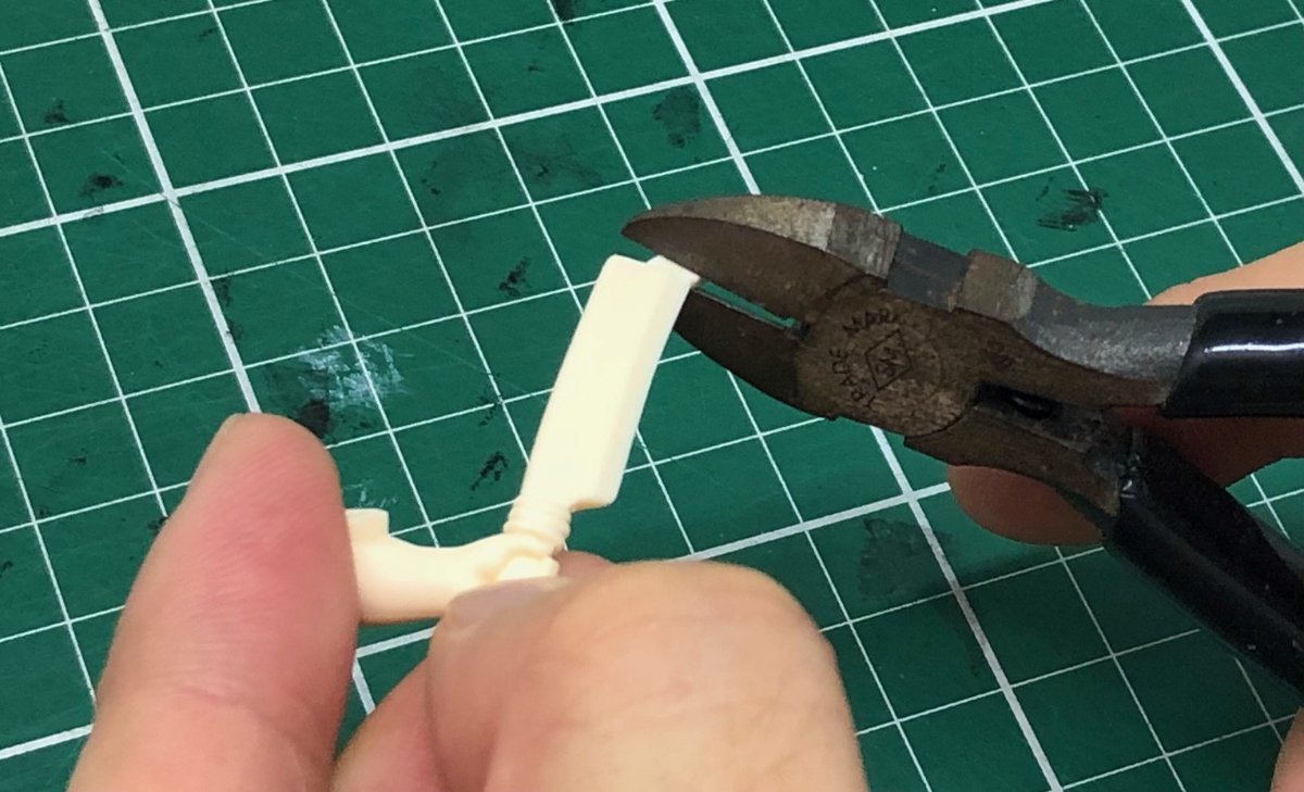 不要部分の「ゲート」をニッパーで大まかにカット!残りはデザインナイフで少しずつ削って、最後はやすりをあててなだらかに処理!指で触って変な段差とかなければパーツの整形は完璧!同じようにパーティングライン(段差)もやすりで処理しましょう!