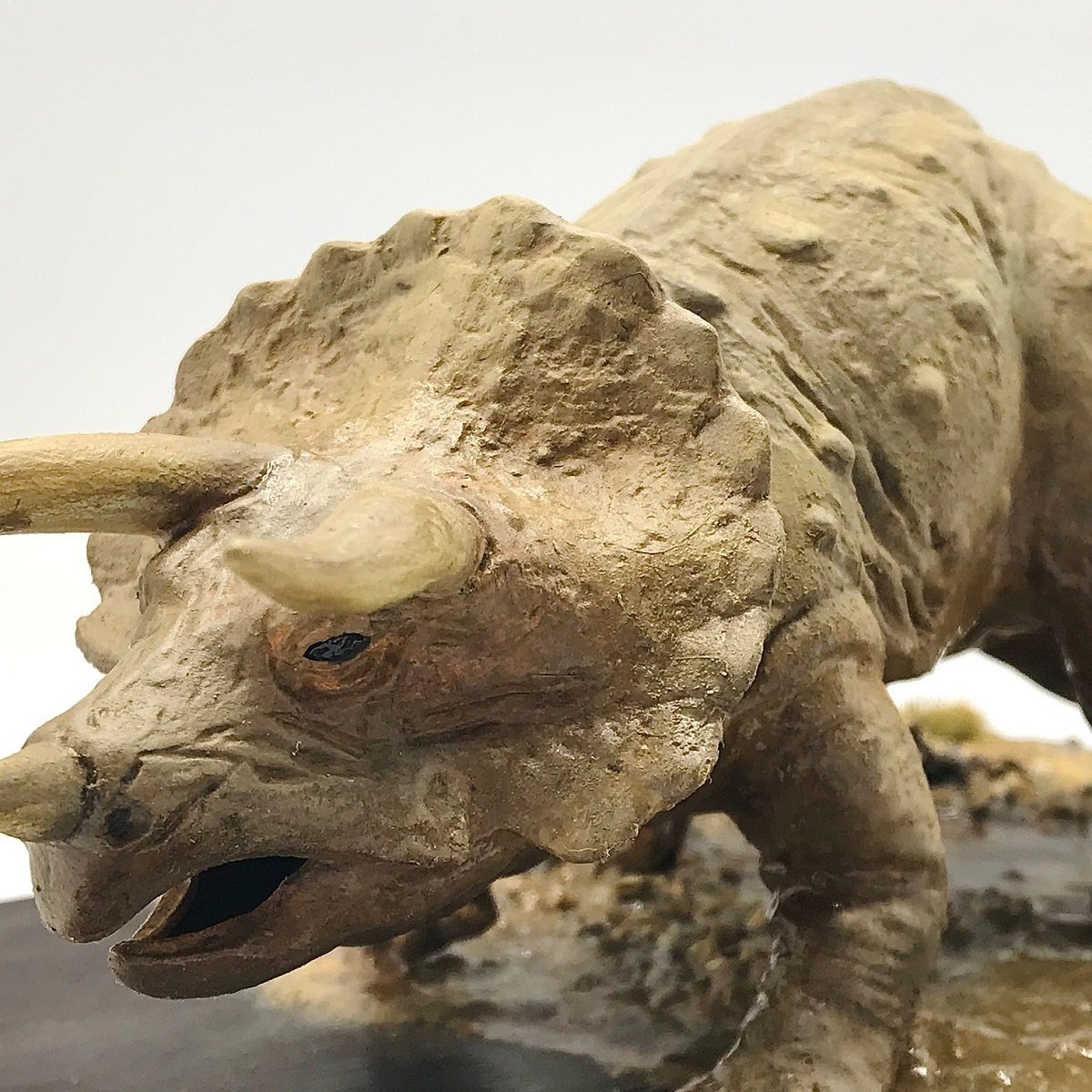 そして注目すべきはやっぱり足元もですよね、しっかりとジオラマで白亜紀のお庭を表現!生物に欠かせない水の表現もしっかり丁寧に施されております。また店長的注目ポイントはその濡れと乾燥の表現ですね。水場から上がってきたかのような足回りの濡れ、また上がってくる際にある程度擦ったのか腹回りやしっぽの裏側もしっかりと濡れた感じを表現してくださったおります。またトリケラトプスの背中から腹にかけてのグラデーションは背中は乾燥、腹は湿っているというのを納得させるような塗分けで細かな仕事が見えますね。恐竜というダイナミックなテーマでありながら繊細さを感じさせる素晴らしい出来っ!皆様の白亜の郷愁に思いをはせに来てくださいね。