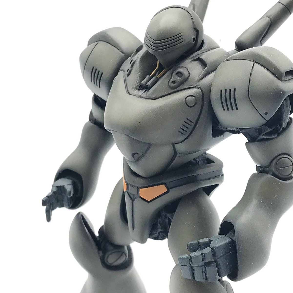 上からも見てみましょう!ここでも改修ポイントありますね、首回りもしっかりとディテールアップ!真鍮のパイプ表現がよりブロッケン元もの筋肉質にもみえる造形に鎖骨の様にマッチングしていてとっても素敵です。この角度から見ると特に腰回りが詰まった感がよくわかりますね、それでいて違和感もない!本来であればパトレーバーシリーズのキットならではと言える接合部分のラバーパーツがより見えたとも思うのですが、バランスのいい感じで見え隠れ!詰まっている分、手足も詰まってますかね?これ?本当に見事なバランス感覚!
