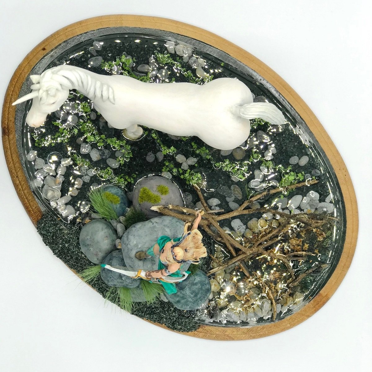 あとまぁ、情景のこの完成度がすさまじいですよね。アップでも取っているのですが尺の都合でこんな感じで失礼します!完成度を高めているポイントは何点あって、1つはその透明度ですね、ユニコさんの写真に戻って足元を見てもらうとわかりますが驚きの透明度です。気泡もなくしっかりと中が透過して見えるので2人がいるのにぴったりな清らかな清流(那須高原っ!)を妄想できます。2つ目はあえてのはみだし、湖の綺麗な縁で丸く囲むのではなく一部を外までギリギリまで浸食さることでベースだけではなく作品の奥行きを感じることができるようになっている。3つ目は本物と造形の融合!台座など自分のこう置きたいという位置は造形で作りつつ、周りにバラストや枝などの本物を配置することでよりリアル感が増している・・・・大きいが細かいところまで神経が入っている作品、ぜひマジマジ見てくださいね。