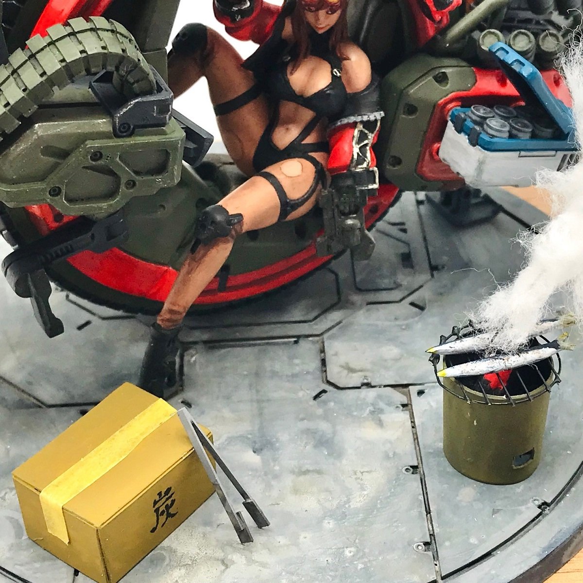 忘れちゃいけないこのキットの主役!サンマです!もう世界観が面白すぎるっ!最新技術の近未来オンパレードのようなキットの中でこの昭和感満載の炭とサンマですよね!もちろんトングも自作ですよね!緊張感が詰まった造形の中にこうやってほっと一息気が抜けるようなアクセントは本当にセンスとしか言いようがありません。いきなりですがbell様は【カウボーイビバップ】っていうアニメ好きですか?店長は大好きです!まるでそこに出てきそうなワンシーンでもう好きが止まらない!ミサイルパックのように添えられたクーラーボックスの中がビールであってほしい!またそれをしれっと煙まで再現して作るところがさすがのbell様なのです。世界観にそれを作り上げられる技術の高さぜひ店頭に見に来てくださいね。