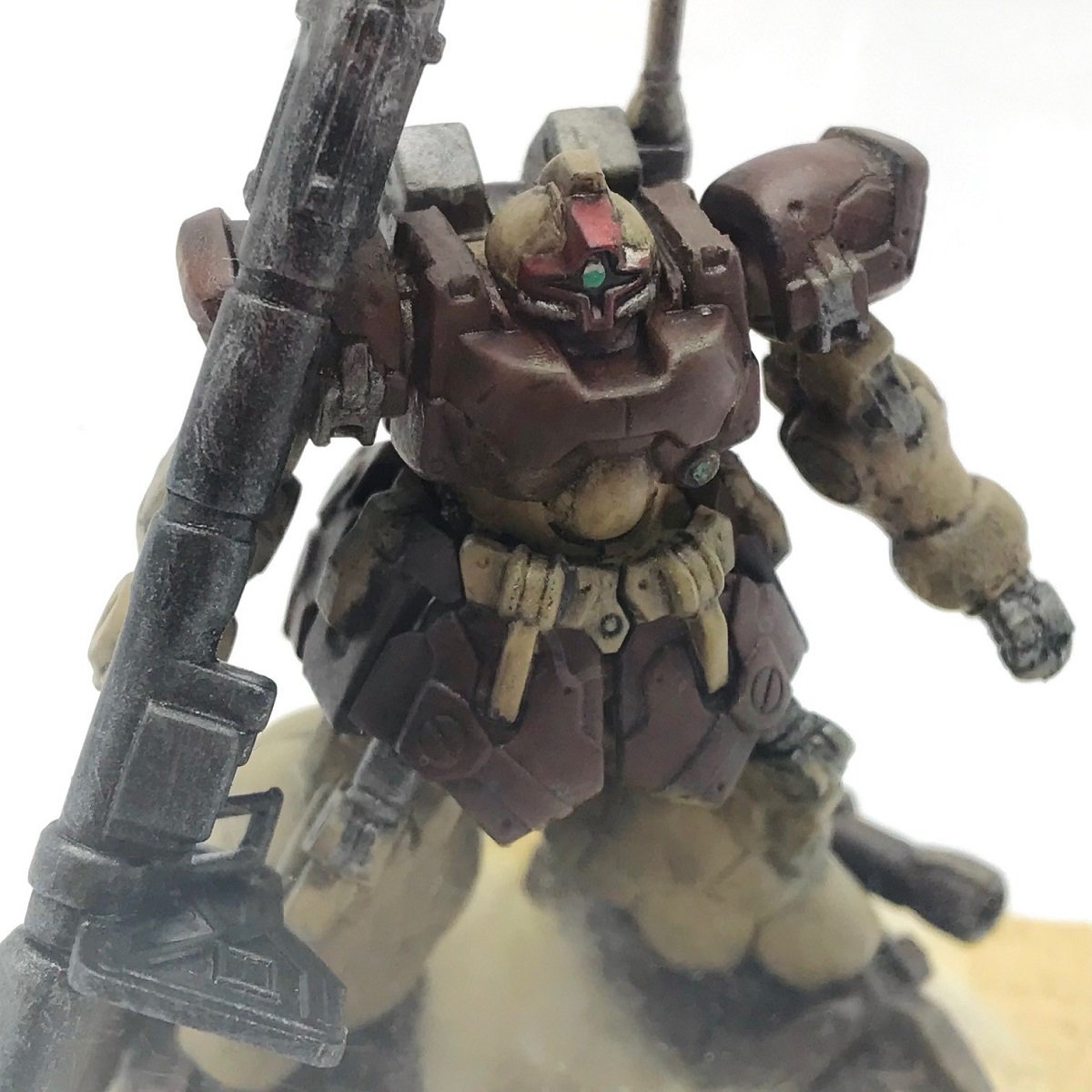 こちらご尊顔アップの時間がやってまいりました!本当にBANDAIの技術の粋を集めて作ったのでは?と思わせるほどに精密なつくりをしているアーティファクトシリーズ!この大きさにアップしたところでディテールの半端なさがお分かりいただけるだろうかっ、まぁこれはKT2様の塗装があってこそと言う部分も大いにあるのですが、見てくださいよ!今回はサンドカラーでまとめてくれておりますが、どうしても目が行ってしまうモノアイですね!なんと言う小さい範囲にこれだけ綺麗に丸く塗装をするのか!しかもハイライトまで入れる徹底ずみ!目が飛び出るほどのブラシコントロールの精度です。またモノアイだけでなくそれ以外の部分に関しても細かな塗分けがしっかりと行われているこの驚きっ・・・・!顎下のパイプはもちろんの事。胸部にあるしれっと配置されたこれも初めからディテールがついていることも驚きですが、リベットが打たれているではないかっ!しかもリベットを綺麗に塗り分けしているではないかっ!墨入れでメリハリをしっかりつけるだけでなく細かなところもコツコツとっ!って本当に素晴らしい!