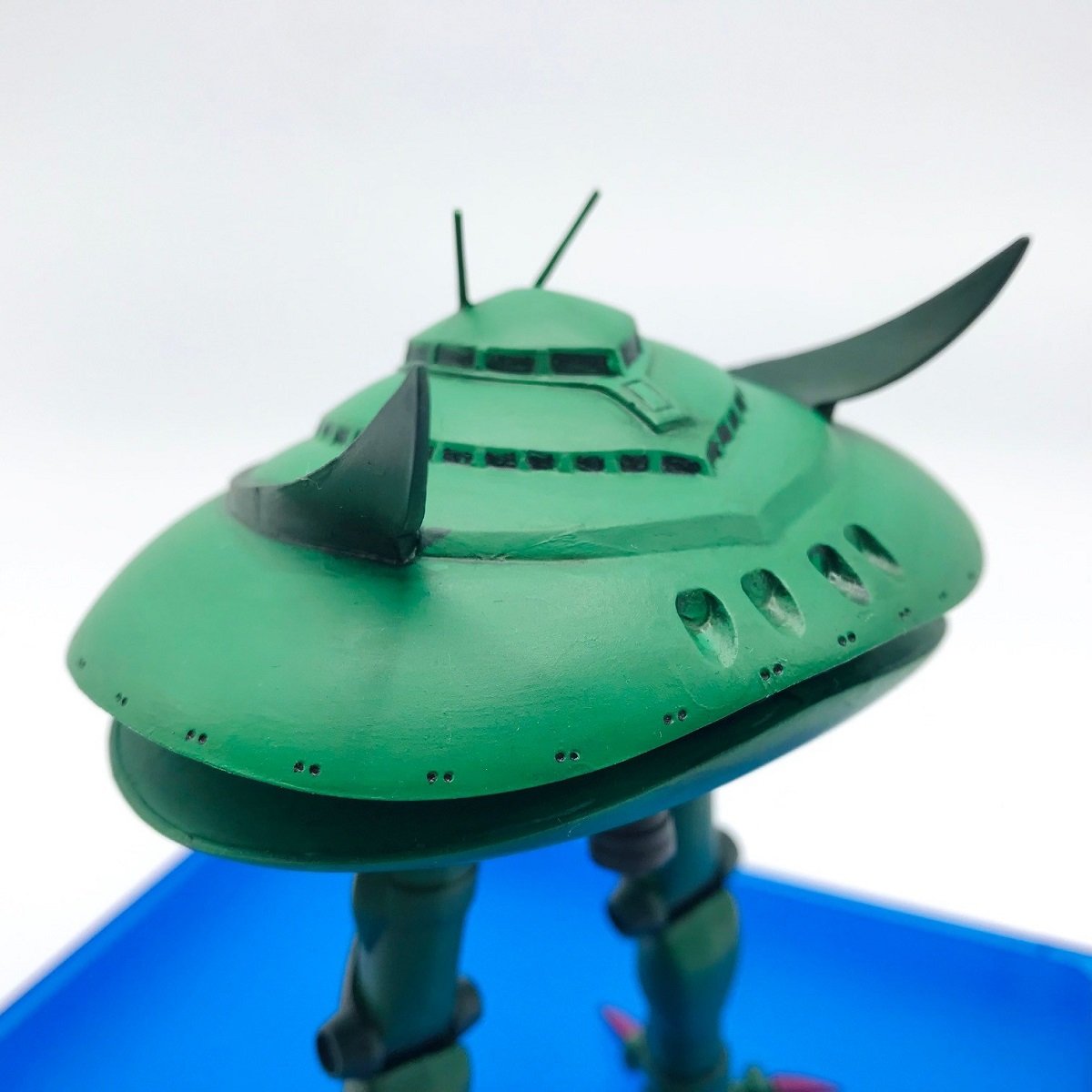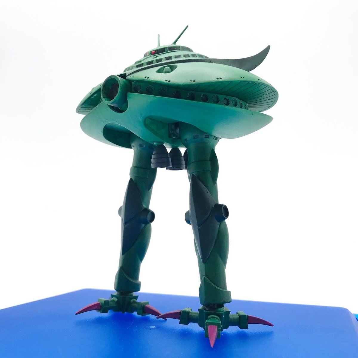 ズーン!という事であおりの下アングルから見ていきましょう!いやぁ~下からみても本当に綺麗ですね!全体的にほぼ同じ緑なのに本当に全体的に均一に塗っていただいております。基本的に全体を均一で塗るには水分濃度もそうですがいかに同じ色で塗り続けるか?という事ですね、調色だとどうしても同じ色を出すのが難しくなるので、チューブだしそのままの色をいかに使うか!まぁそうすると色が濁ることなく彩度を維持したまま塗ることもできますからねっ!そういったのが得なのがファレホなんですがね!なんせカラーが1000色以上あるんだからねっ!まぁ色が多い分選ぶのも大変かもしれませんがそれも楽しい部分と言うことで、見事にビグザムにあったカラーをチョイスしてくださったけいじろうパパ様・・・流石です!ビグザムの全方位攻撃と同じくらいに全方位にムラなく美しい塗装が行われております!頭の先からつま先までもしっかり丁寧言うことなしっ!