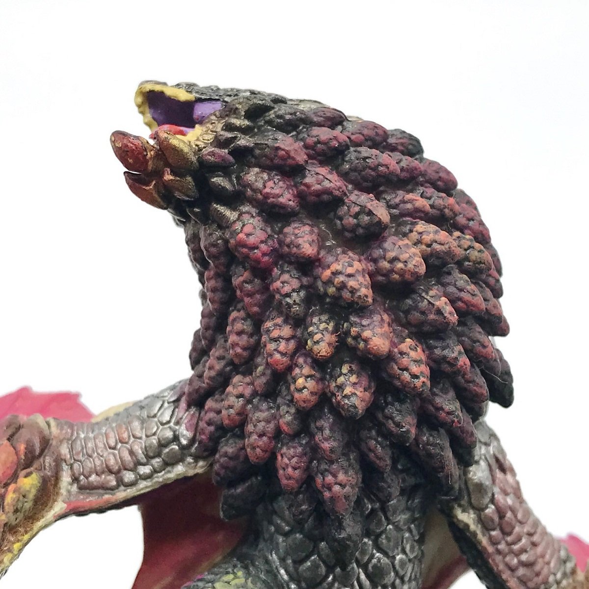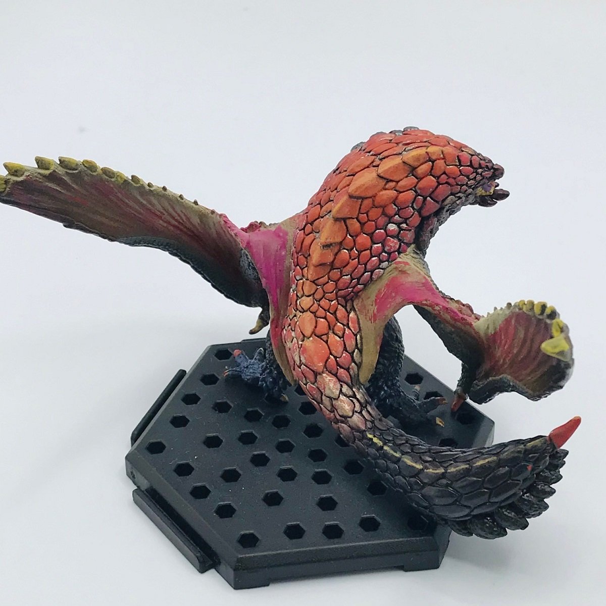 はい!そして亀さんと対をなしているのがこちらカプコンの大人気作品!モンスターハンターさんからぼとぼと落とすでおなじみの「爆鱗竜(ばくりんりゅう)」バゼルギウスの登場です!いやぁ~モンスターハンター スタンダードモデル Plus Vol.12のバゼルさんですかね?めちゃかっこいい!元のモデルは怒りモードじゃない時のバゼルさんなんですが、けいじろう氏の手によって怒り狂うバゼルさんができあばっているではあぁ~りませんか!驚くべきはその色彩センスですよね、怒り狂い熱を持ち出した体をただ赤に塗るのではなくしっかりとグラデして明るい色を中心にもってきているセンスの良さ!はじめての塗装とは思えないほどのカラーバランス感覚です!また全体を綺麗に塗るのではなくしっぽに向かい効果的に塗装ムラというか塗装残しをしているあたりすでに計算高い塗装センスを感じられずにはいられない!