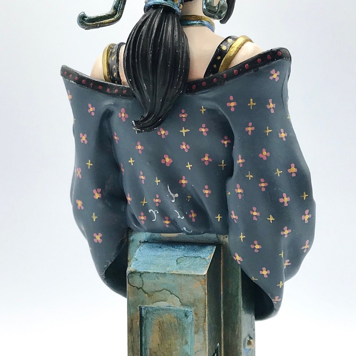 後ろからも見てみよう!お顔や髪飾りなどにも注目しがちですが、店長的に注目をして欲しい一つはこの洋服にもあります!肌の白さを強調するように暗く落ち着いた色に塗られた府ですが、そこにびっしりと書かれた・・・・小紋!小紋!小紋!しかも手描きっ!造形の凹凸を意識しながら丁寧に一つずつバランスよく描かれております!この小紋があることで作品の印象が暗くなりすぎず、また少女のかわいらしさもプラスされてそれこそベースと髪飾りにの重厚感に負けないようになっていますね。