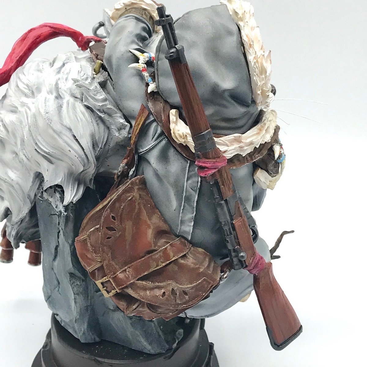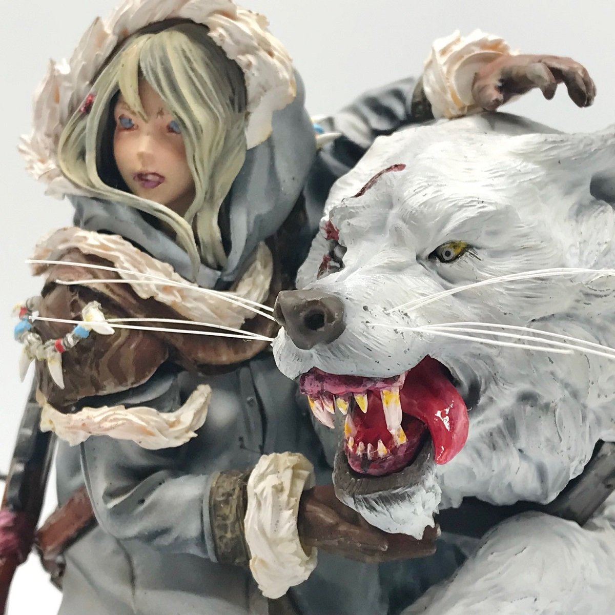 横からも見てみよう!白い狼!ただ白一色でとなると何とも単調となりがちですが、下地を生かした塗で部分的にグレーに見えることでイッヌ様の質量を思う存分感じられますね。たなびく布や金属パーツの輝きもとてもいいですよね!女の子のフードにも白いファーがついておりますが、同じ白系の塗装でも色味を変えることで印象ががらりと変わる!モデルにあった塗はさすがですっ。