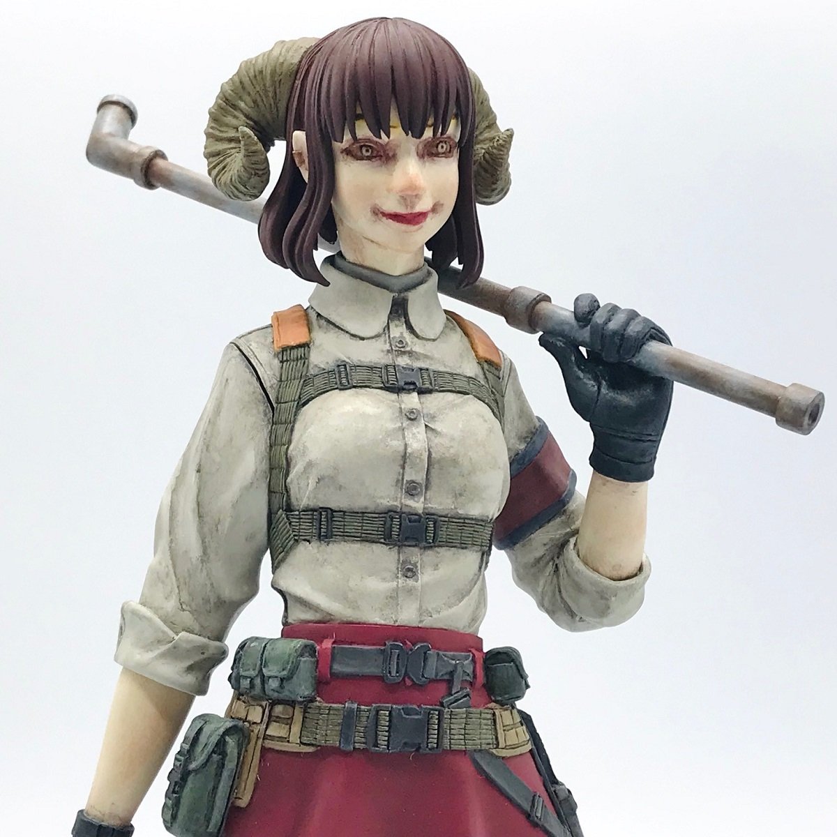 んだば!アップから見ていこうぜぃ!頭からヤギ角が生えている女の子・・・、悪魔ですね!悪魔っこですね!まさに悪魔っこの印象にふさわしいこの瞳の塗装をアップにしてご覧いただきたい!キットはさほど大きくもなく小さくもなくといった感じですが、可愛い印象をなくすためのあえての三白眼が丁寧に塗られております!また瞳孔を印象付けるためにギンギンに光らせた虹彩!さらにそれを印象付けるためにより暗く塗られた瞳のコントラストに目が離せなくなりますね。