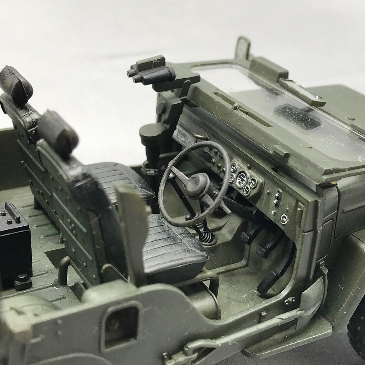 さぁまずは社内を少し見ていきましょうね!いやはや本当に細かいっすよね~!だって1/35ですものね、少し違いはするものの皆さんがイメージする車のパーツが1/35になっているのですもの!めちゃ小さい!組み立てるだけでも実際の色味に近くなってはおいりますが、ウォッシュをかけていることで立体感が出てきますよね!また特徴的な誘導用の操縦機や双眼鏡もばっちり装備!狙い打ってやる感がひしひしと伝わってきます!